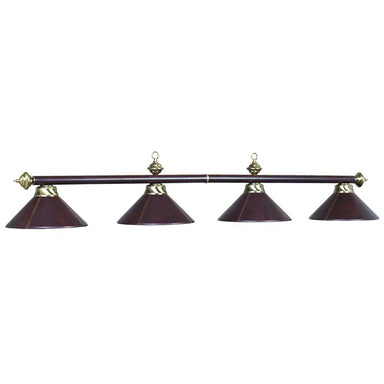 Wrapped in faux brownleather and accented with linear stitching, four shades complement a metal frame on this 54-inch four-light billiard pendant. ...