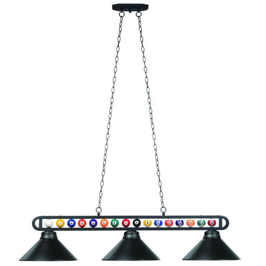 A set of racked balls add colorful fun to complement this three-light billiard pendant with traditional-style glass shades. Features: Material: Me...