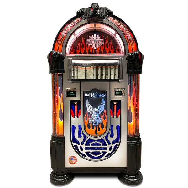 The Harley-Davidson CD Jukebox in brushed aluminum is manufactured by Rock-Ola: creators of the only true authentic, brand new American CD jukebox on the planet.