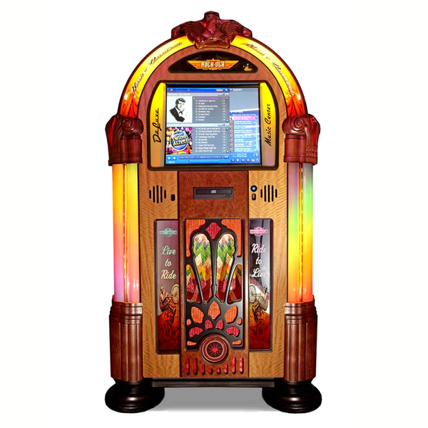 The more digital focus of the Rock-Ola Slimline Music Center jukebox means it is better suited than ever to mobile devices and sophisticated MP3 players, allowing you to download directly from a USB device, sync playlists to your device, or simply play your MP3 directly through the jukebox.
