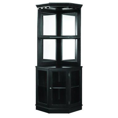 A stylish and effective use of corner space. This lovely black cabinet has storage space below and wine stem holders up top. The included mirror wi...