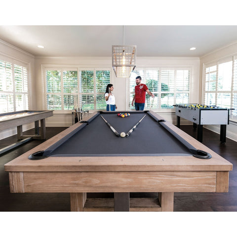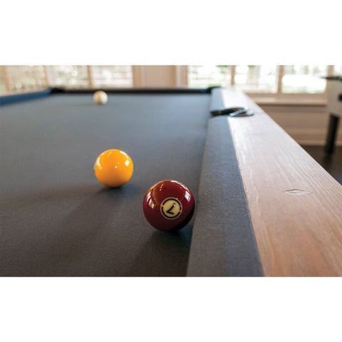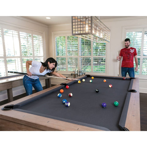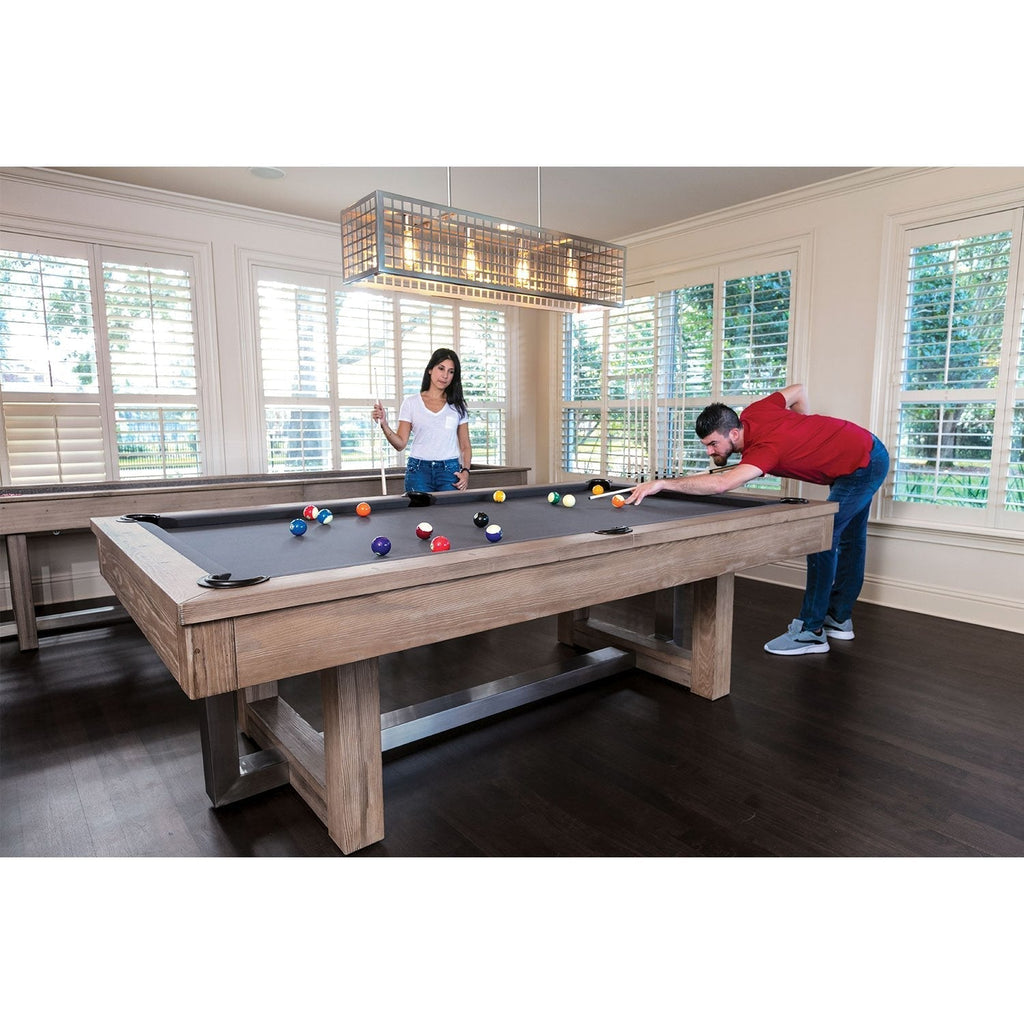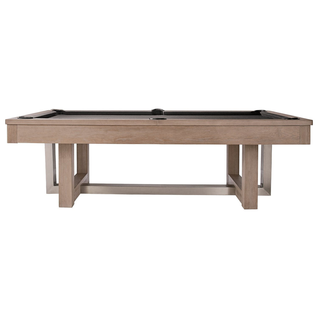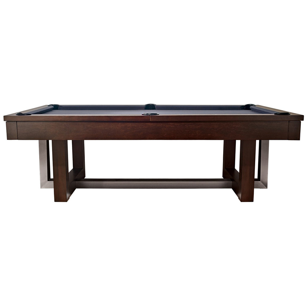 Elevate your game room to the next level with the American Heritage Abbey Pool Table. This contemporary masterpiece combines hybrid materials for an elegant, transitional look. Featuring chrome hammered diamond rail sights, brushed stainless steel elements, and internal drop pockets, the Abbey pool table is a statement of style and quality. Choose between the Espresso or Antique Grey finish options to suit your aesthetic preferences.