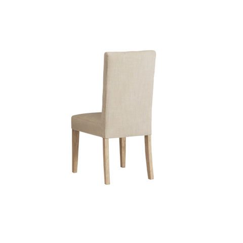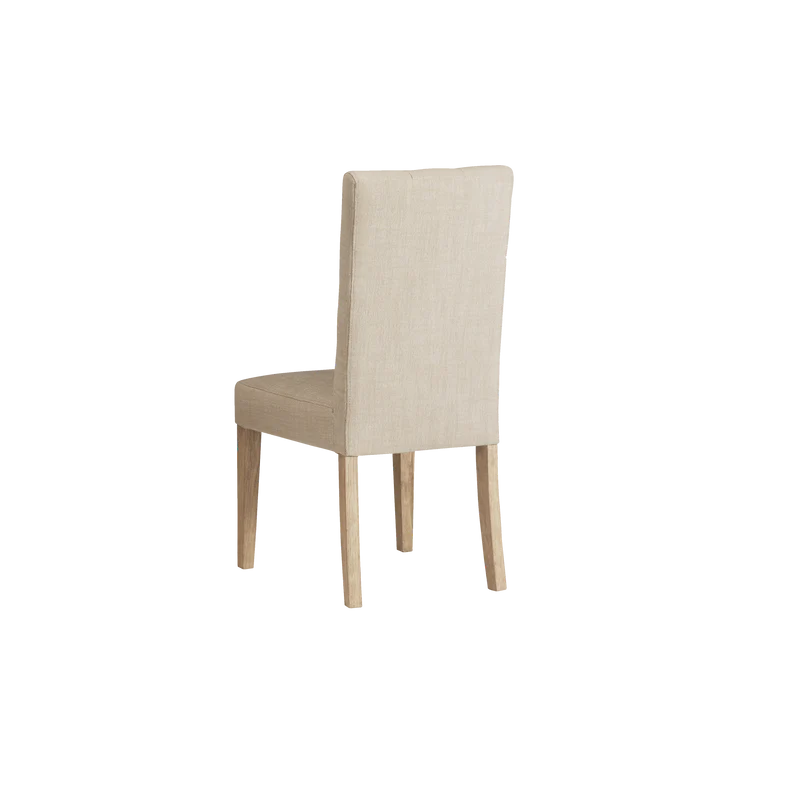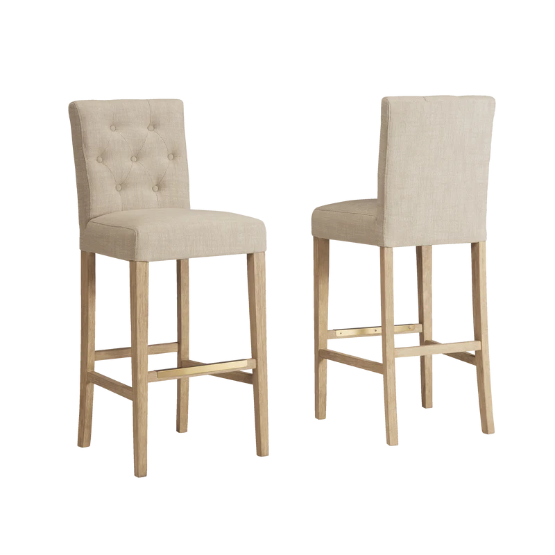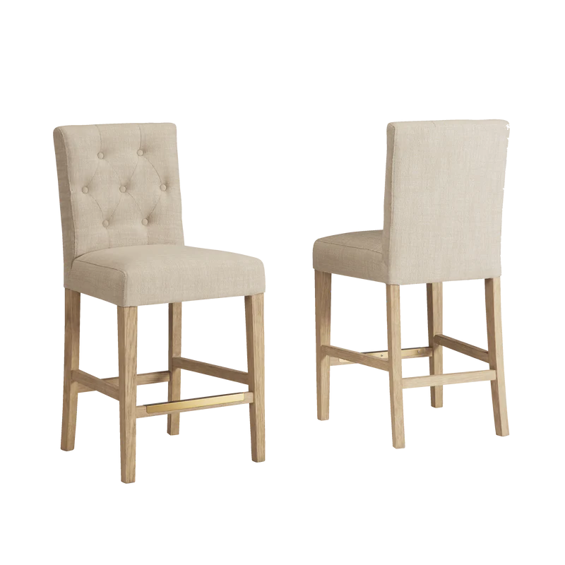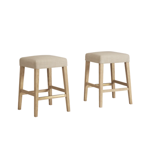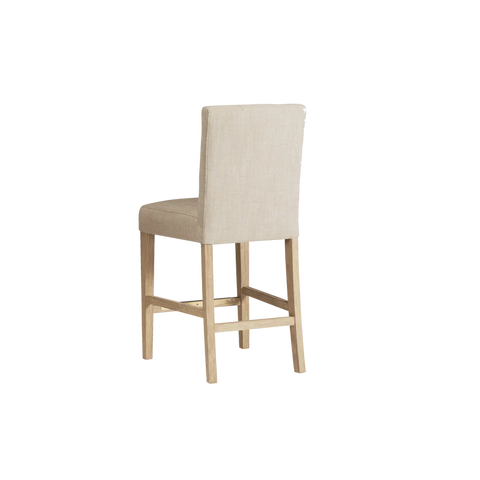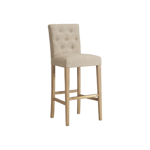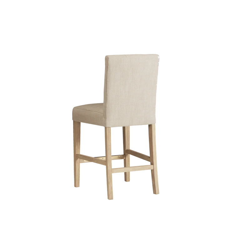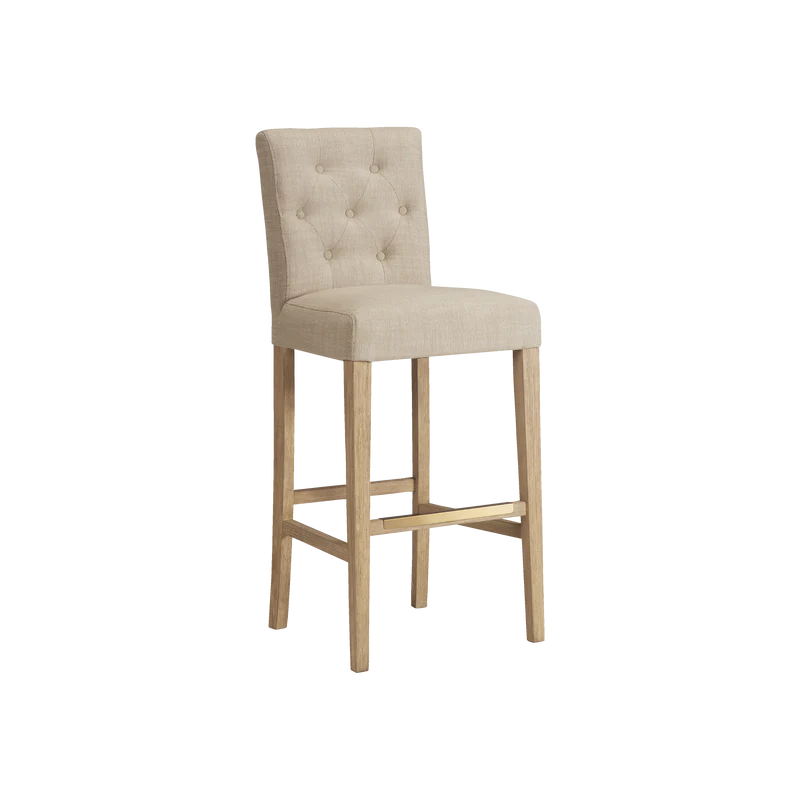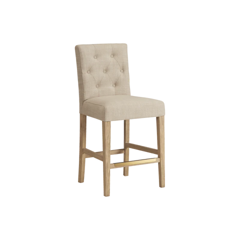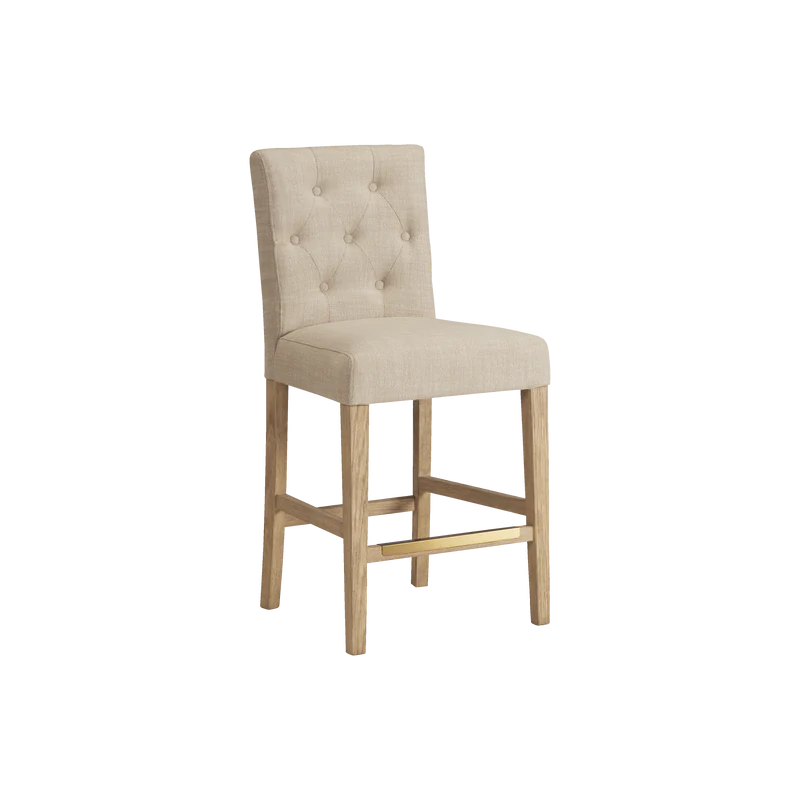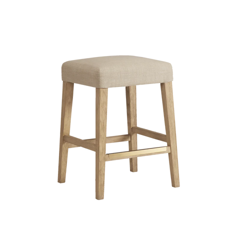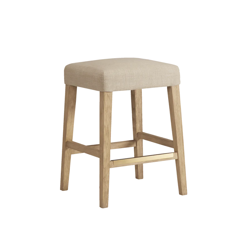 Finished in White Oak with Sahara Sand linen upholstery, the Port Royal Stool features, satin brass metal footplate, webbed seating for improved comfort and a 3" linen cushion.