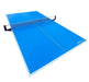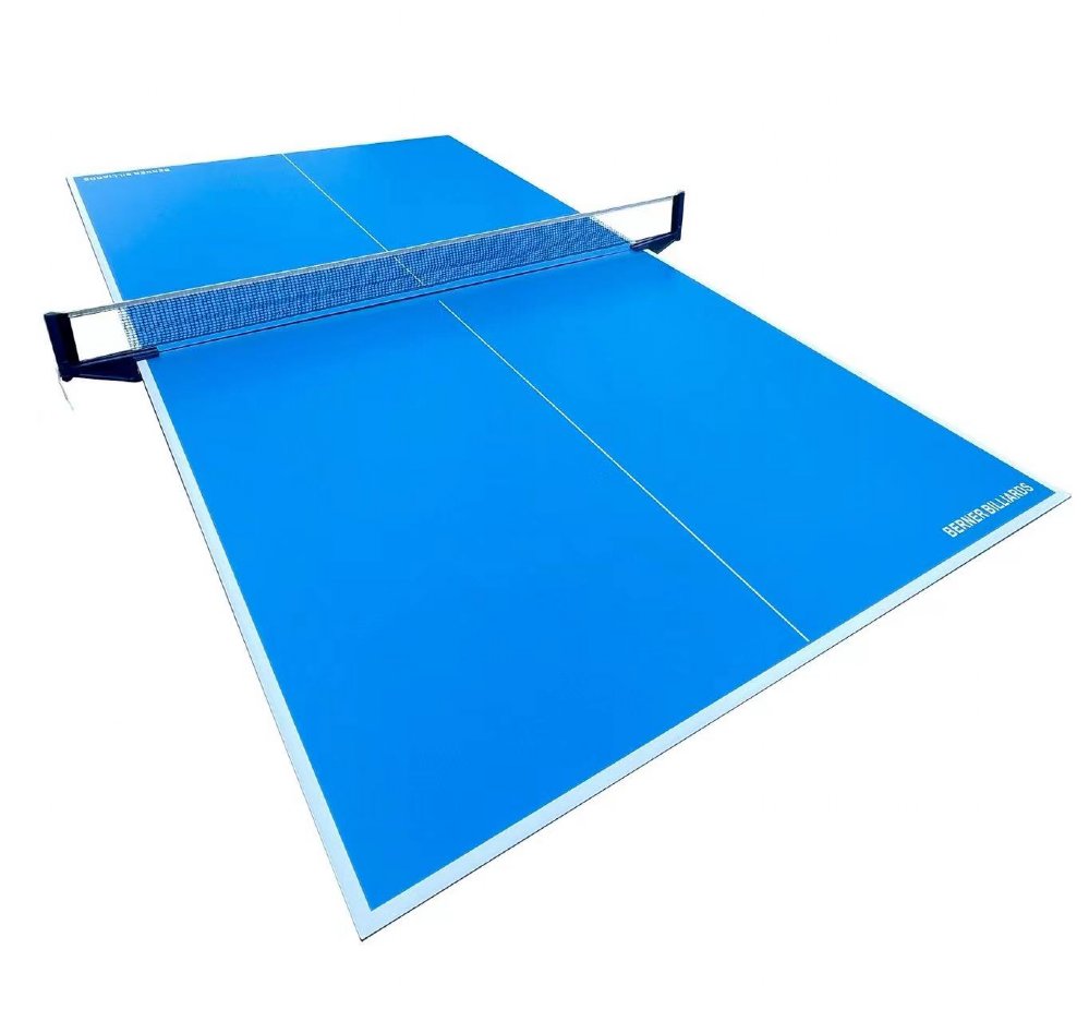The outdoor ping pong table conversion top features a 6mm blue playing surface with anti-glare coating. It is easy to set up, easy to store, has a protective cushion to protect the table underneath and comes with a net & post set.