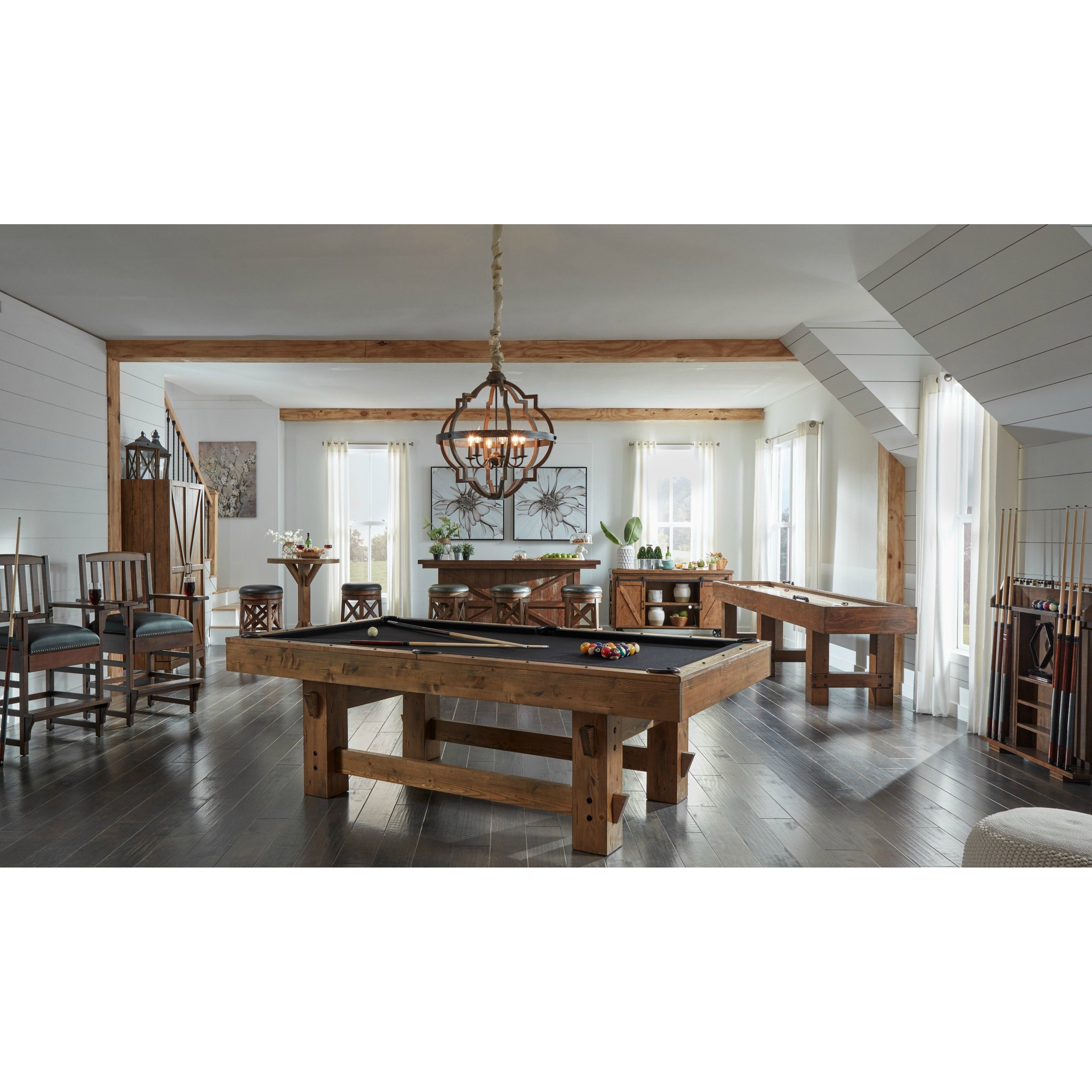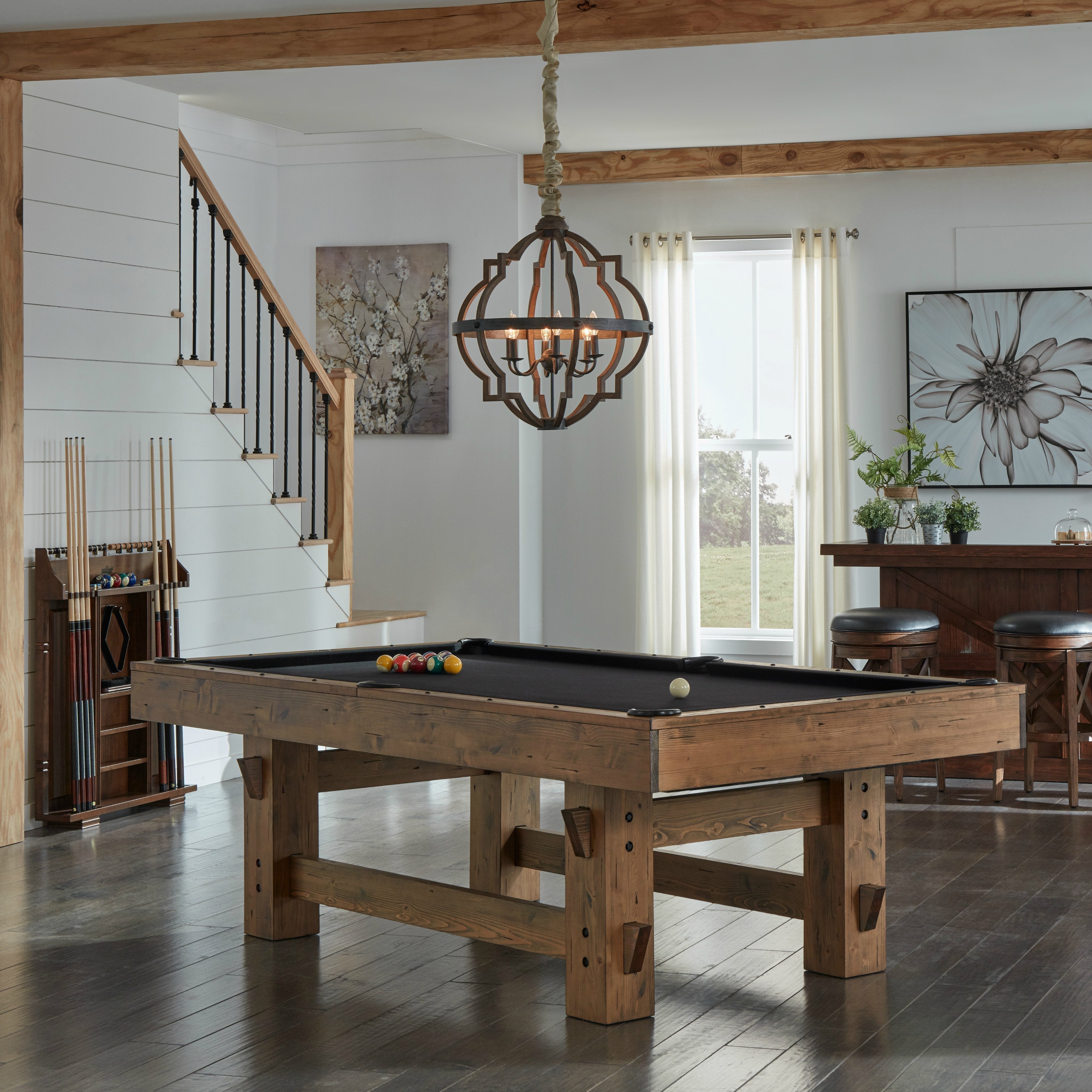 The Bristol pool table is a refined rustic design that naturally compliments home décor with its unique charm. This billiard table features raised black hex bolt metal rail sights, pastoral style design, and internal drop pockets.