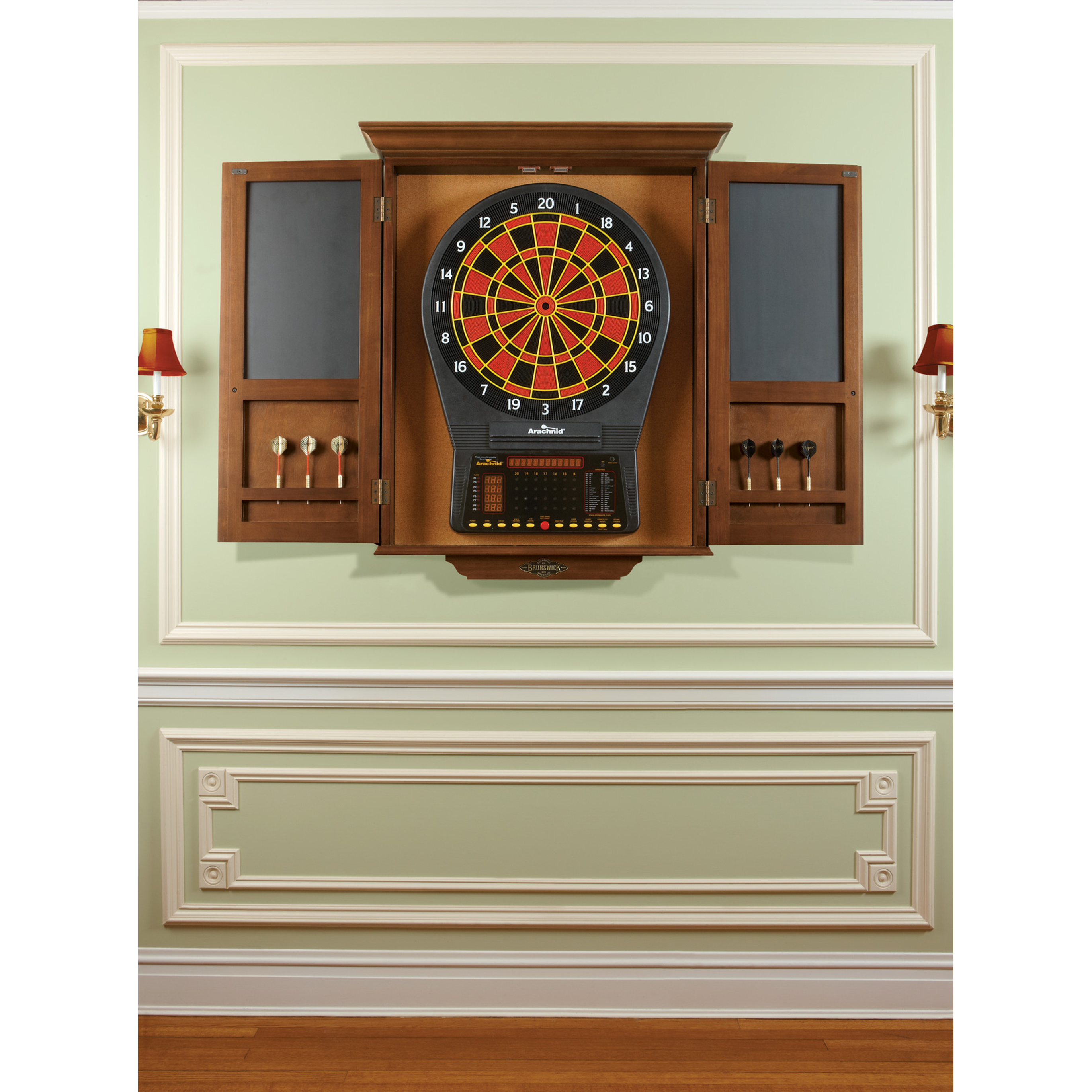 The Brunswick dartboard cabinet is a great addition to any game room and provides the best solution for keeping your game organized and your walls protected. Its cabinet doors feature double chalk scoreboards, magnetic catches, chalk groove and dart holders for storage. Features a cork backboard for steel-tip darts.