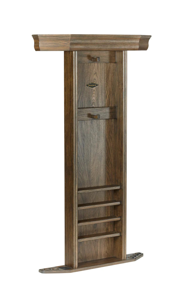 Beautiful closed-back transitional wall rack. Louis-Philippe style angled header panel. Features the standard Brunswick wall mounting system. Some assembly required. Holds all the contents of a play package (sold separately): Up to eight cues, 8-ball rack, 9-ball rack, set of billiard balls, brush and chalk.