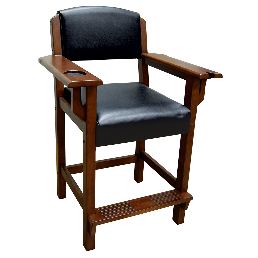 Take a seat while your opponent tries to run the table. Featuring a plush seat and back, a drink coaster built into one arm and cue holder in the other, the Traditional Player's Chair is the perfect place to wait your turn. You'll sit high enough to see all the action with its 27" seat height. Offered in beautiful chestnut, espresso and rustic dark brown finishes. Some assembly required.