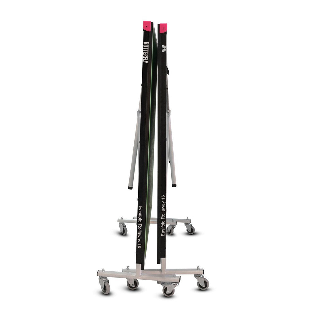 The Butterfly Easifold 16 is a foldable, rollaway table that requires minimal assembly time; countless hours of fun without the hassle. The 16mm top provides a good bounce and playability and is available in vibrant colors of blue or green. It is protected by a strong steel frame and attractive magenta corner pieces that perfectly accentuate the top color, and a level playing surface is guaranteed with height adjusters on each leg.