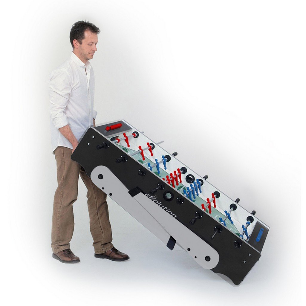 The Foldy Evolution Foosball Table by Garlando blends modern design, space-saving practicality, and exceptional craftsmanship. With its sleek silver and black finish, this stylish table delivers the excitement of professional gameplay, while its foldable legs and integrated wheels make it perfect for compact spaces, easy storage, and portability.