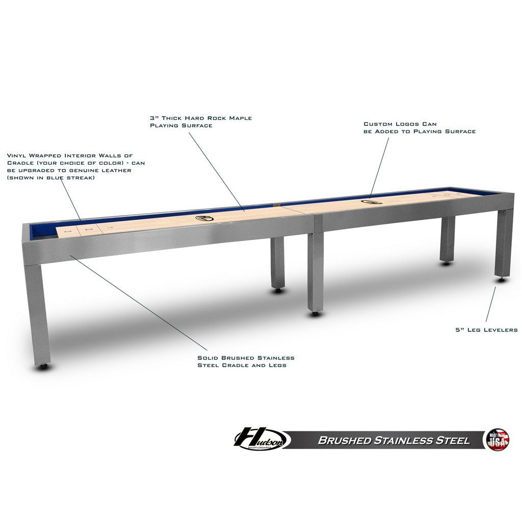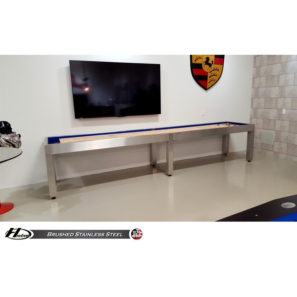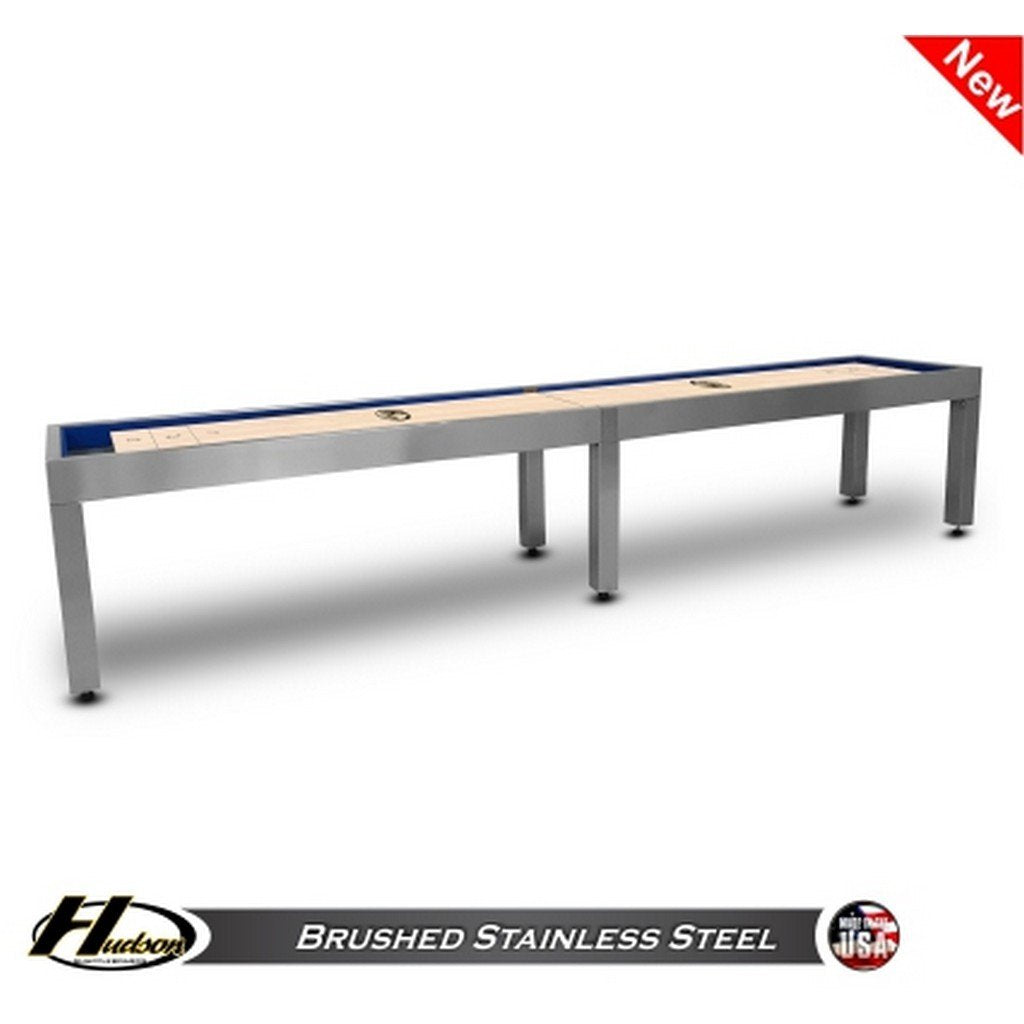 Enjoy playing shuffleboard on a newly designed Brushed Stainless Steel Shuffleboard by Hudson Shuffleboards. Available sizes are 9, 12', 14', 16', 18', 20', or 22' (tournament size).
