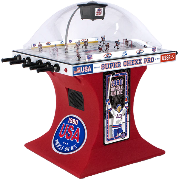 The Miracle on Ice™ Edition of the Super Chexx Pro is an official licensed USA Hockey product. It commemorates the historic Miracle on Ice game, featuring custom hand-painted USA vs. CCCP Jerseys, the national anthem, live action sounds and our 5" LCD Jumbotron with video scoreboard and animations. Bring home the newly reinvented version of our original Chexx game.
