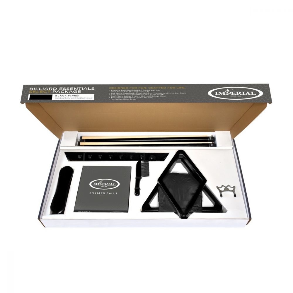 The Imperial Essentials Select package is the most comprehensive of the Imperial accessory kits. It includes the Imperial Select Ball Set, four 2-piece cues, a dust cover, a wall rack, a triangle, a 9-ball rack, a 2-piece bridge stick, a metal bridgehead, an under-rail brush, and a table brush. If that isn't enough, it all matches with our Black wood finish. This package contains all the accessories needed to take care of your game and your table!