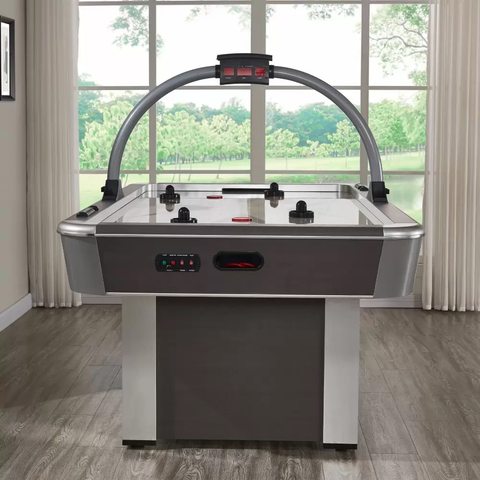 A two-player electronic scoring system is included on the unique overhead arch. The table includes 4 pucks, 4 goalies, 2 additional manual inset scoring systems, and a powerful single fan for optimized gameplay.
