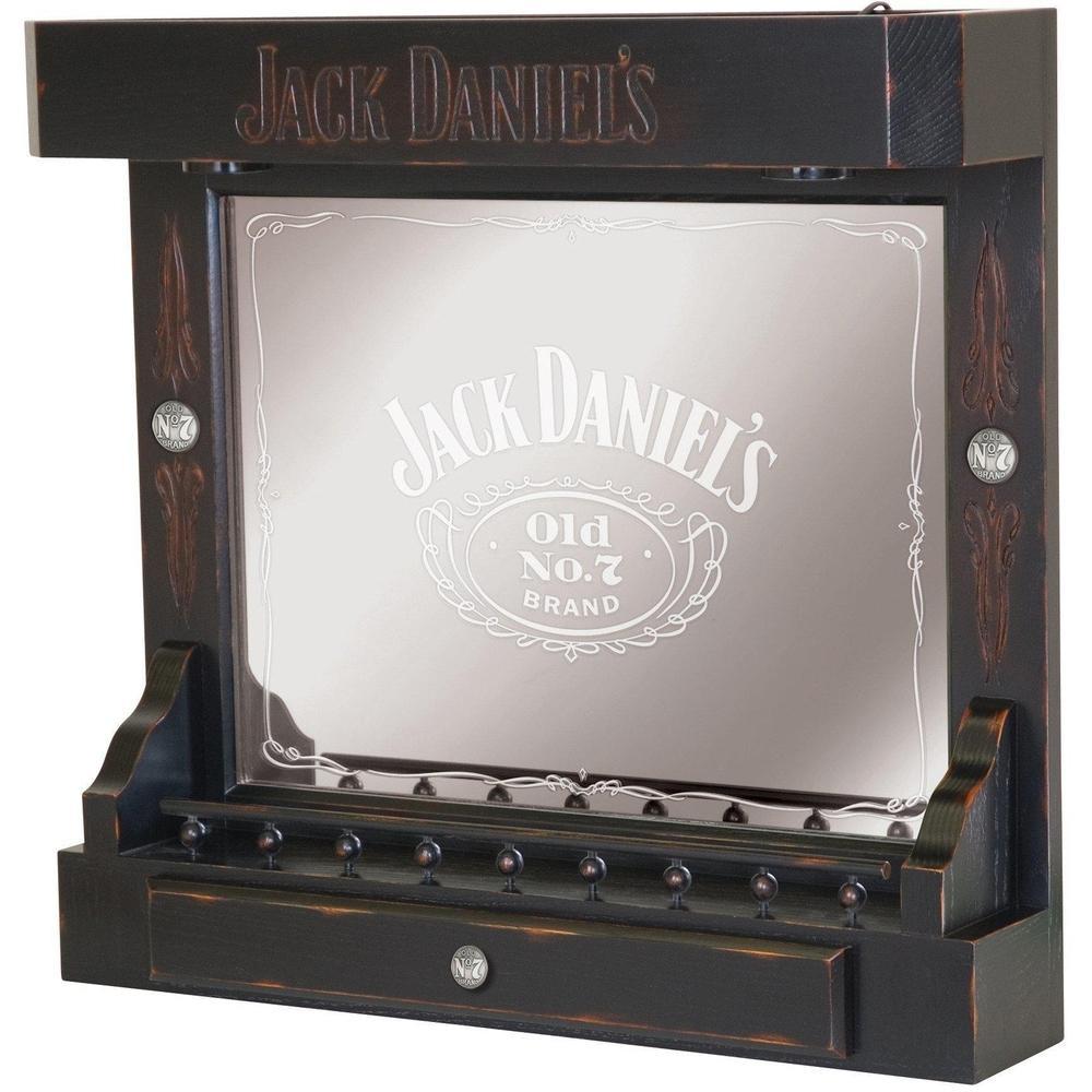 Screen printed mirror with Old No. 7 logo is highlighted by LED lights recessed in the crown. Also includes shelf to display bottles and an antique pewter Old No. 7 drawer pull on the accessory drawer. Makes a great addition to any existing home bar.