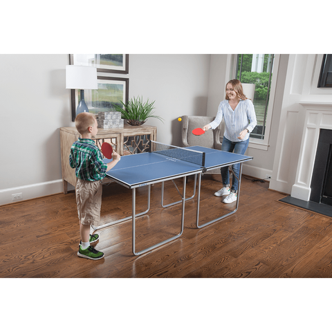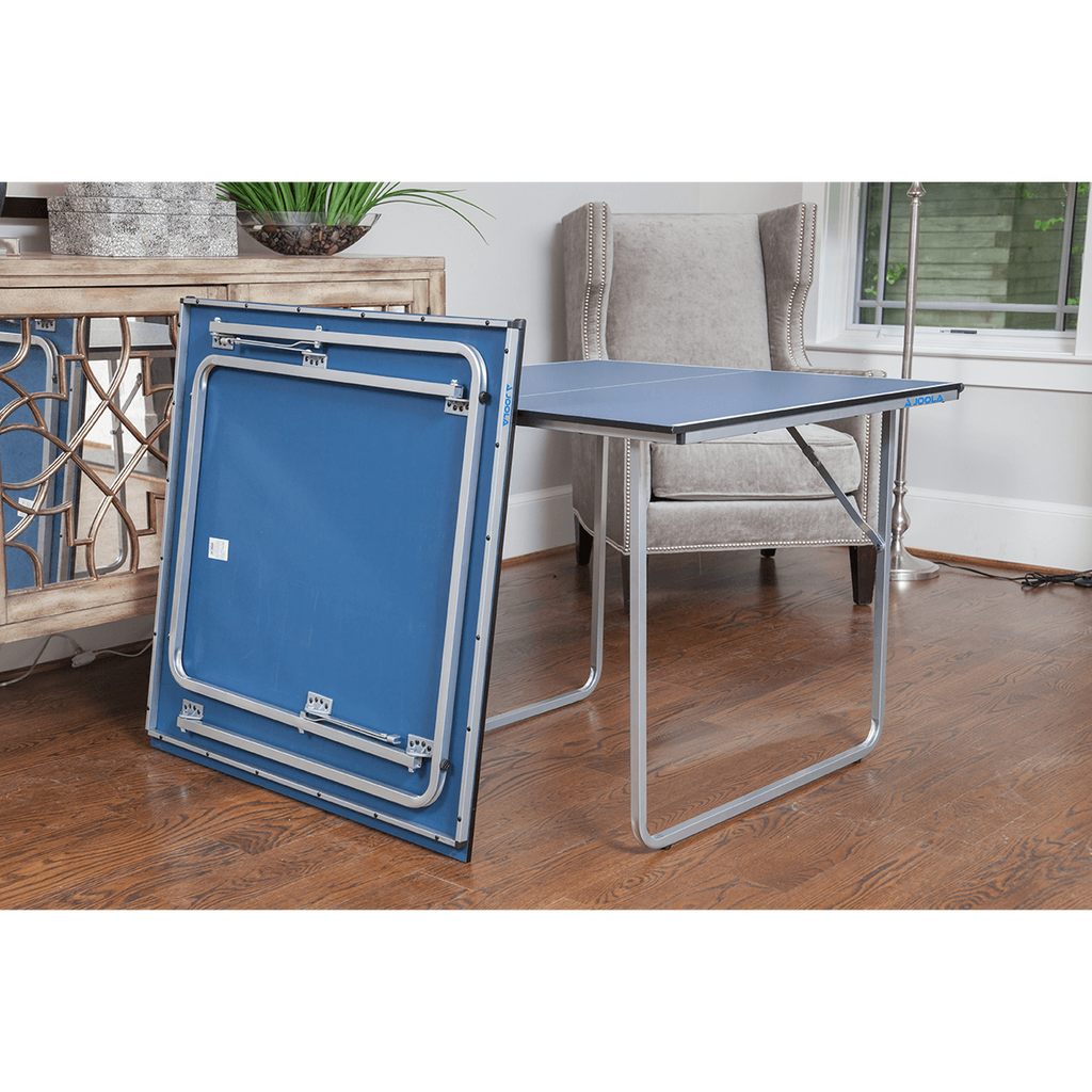 The JOOLA Midsize Blue Table Tennis Table is perfect for anyone who loves table tennis, but is tight on space. Each half of the table is a near perfect square and can stand alone. Other than ping pong, this multi-use table perfect for card games or any of your other table needs.