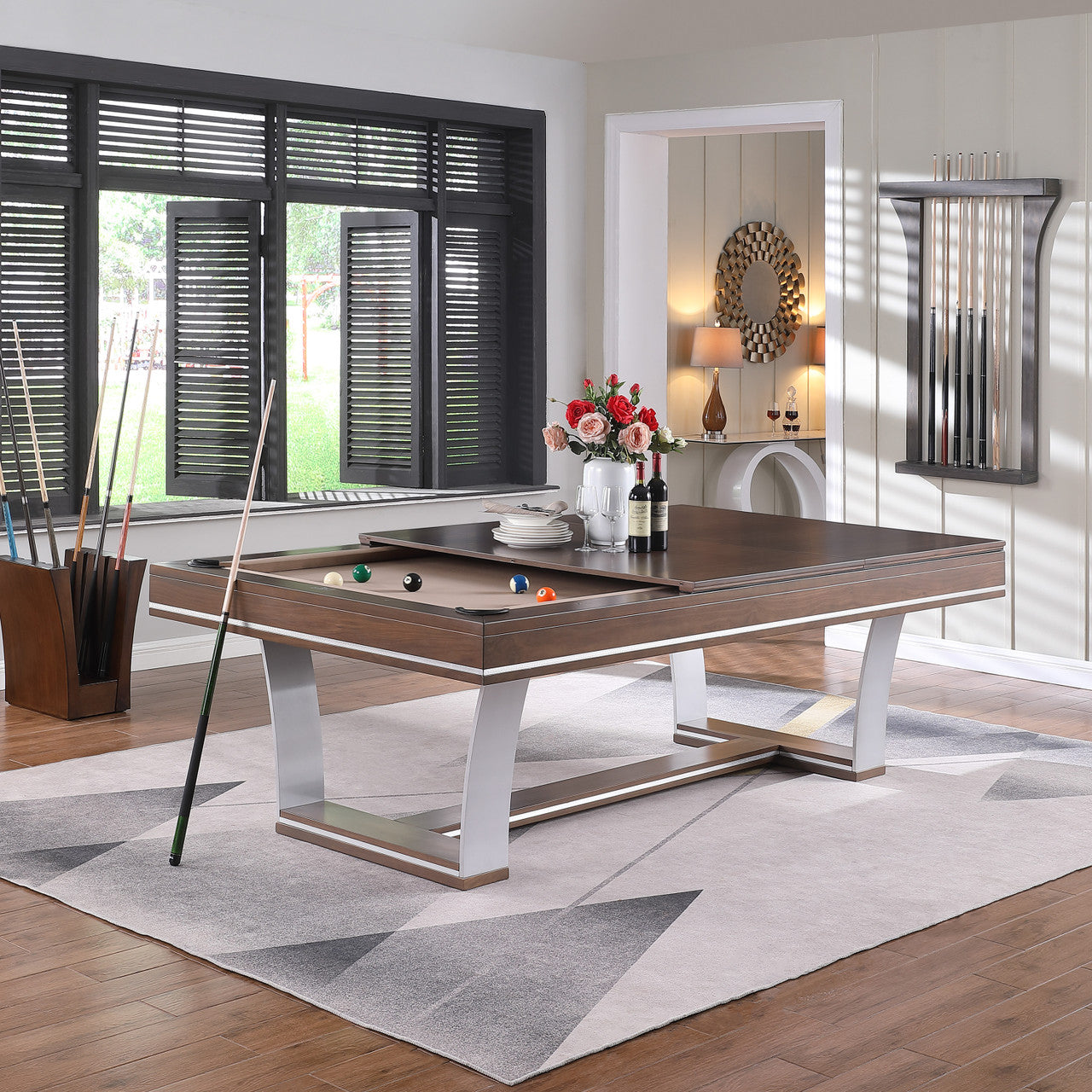 The Barcelona slate pool table features contemporary design in a natural dark Walnut finish. Its Clean lines, graceful arched legs in brushed steel with matching steel inlay will be a standout in any game room.