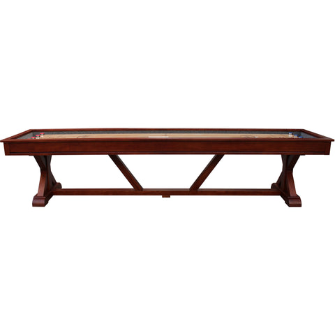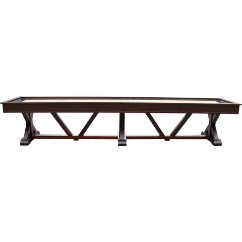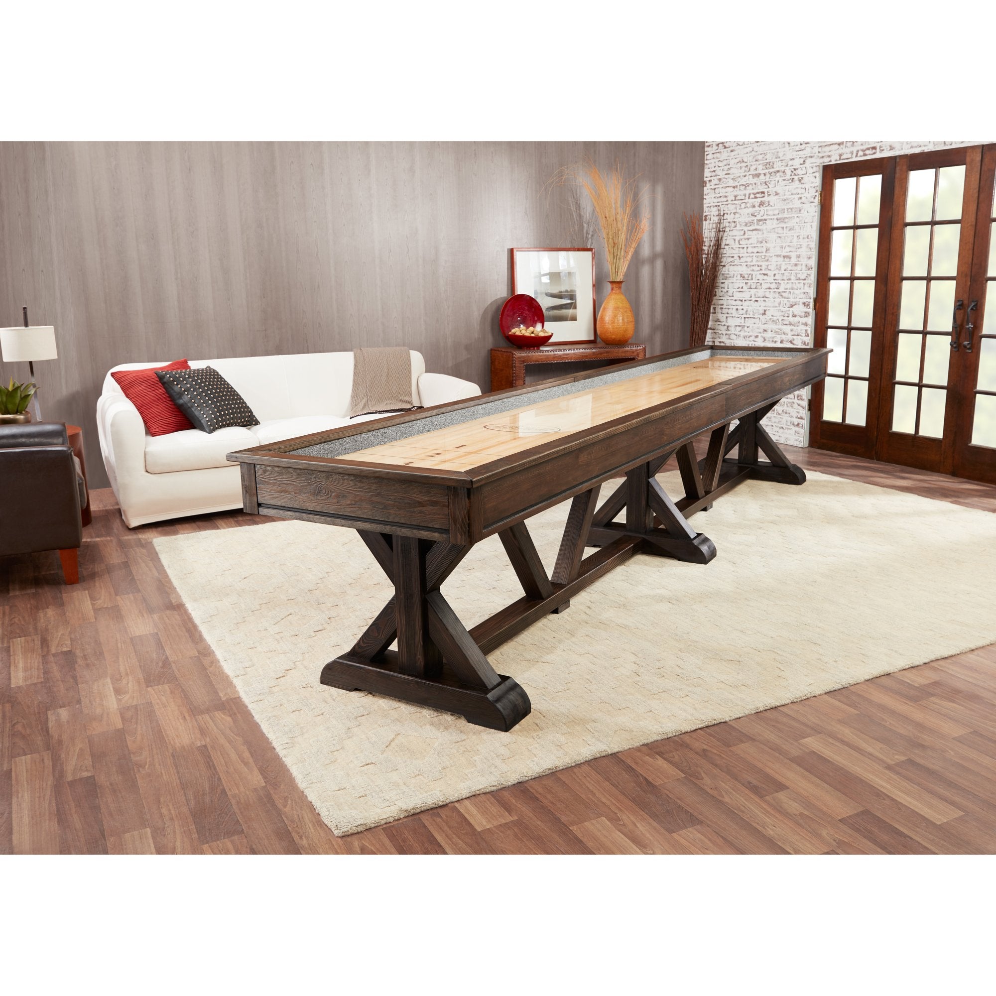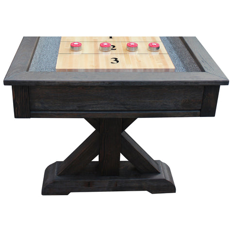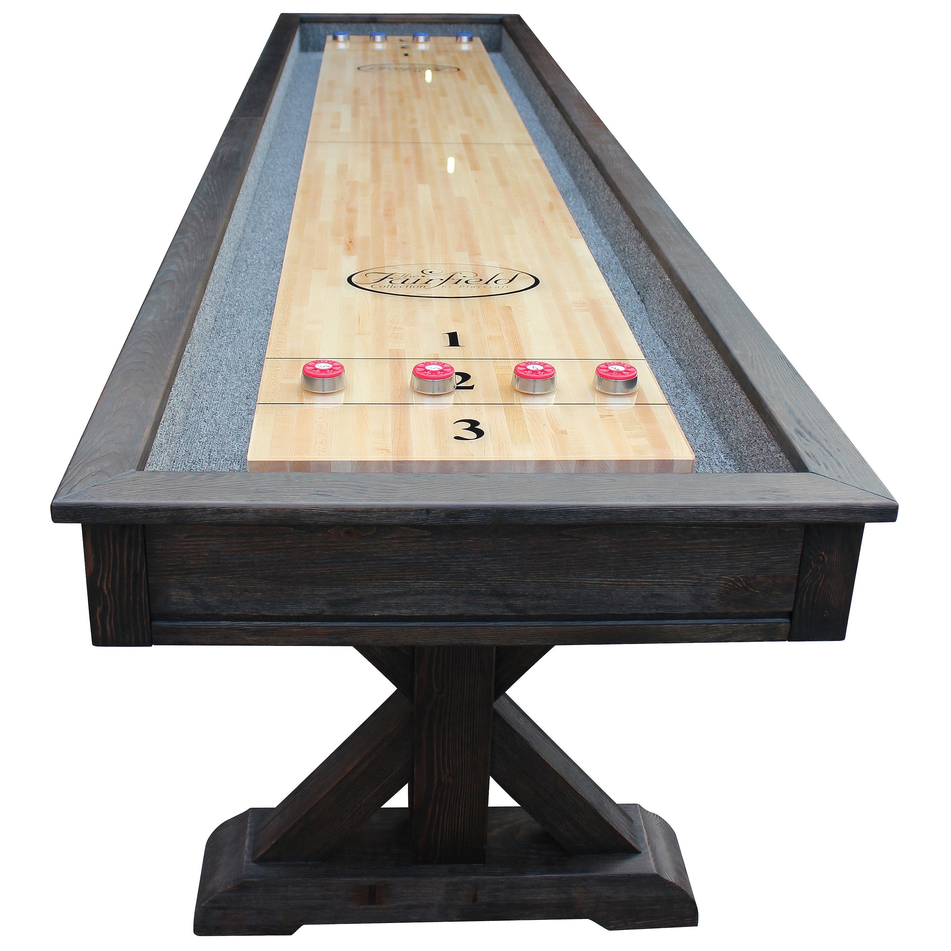 The Brazos River shuffleboards are part of the Fairfield Collection of game tables by Playcraft. The Brazos’ trestle leg design and hand finishing is inspired by old world styling and craftsmanship. Whether your choice is a timeless Chestnut or Espresso finish, or a distressed weathered Black, Barn, or Brown that appears to have been reclaimed from a century old countryside barn, the Brazos is certain to make a statement.