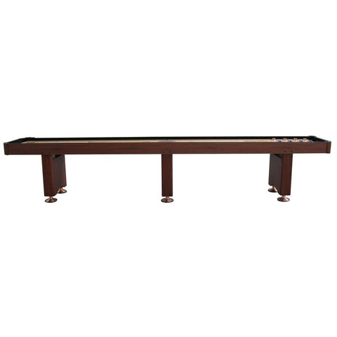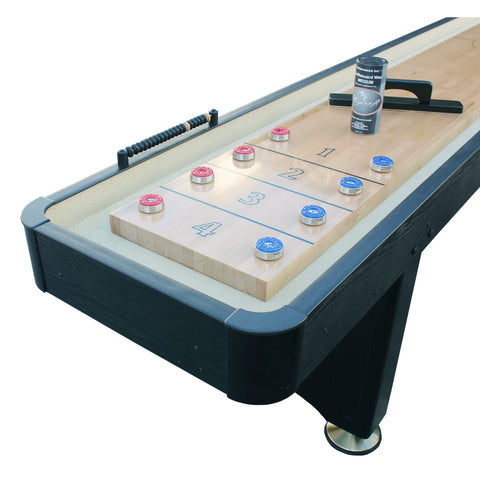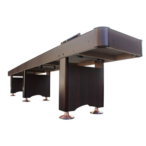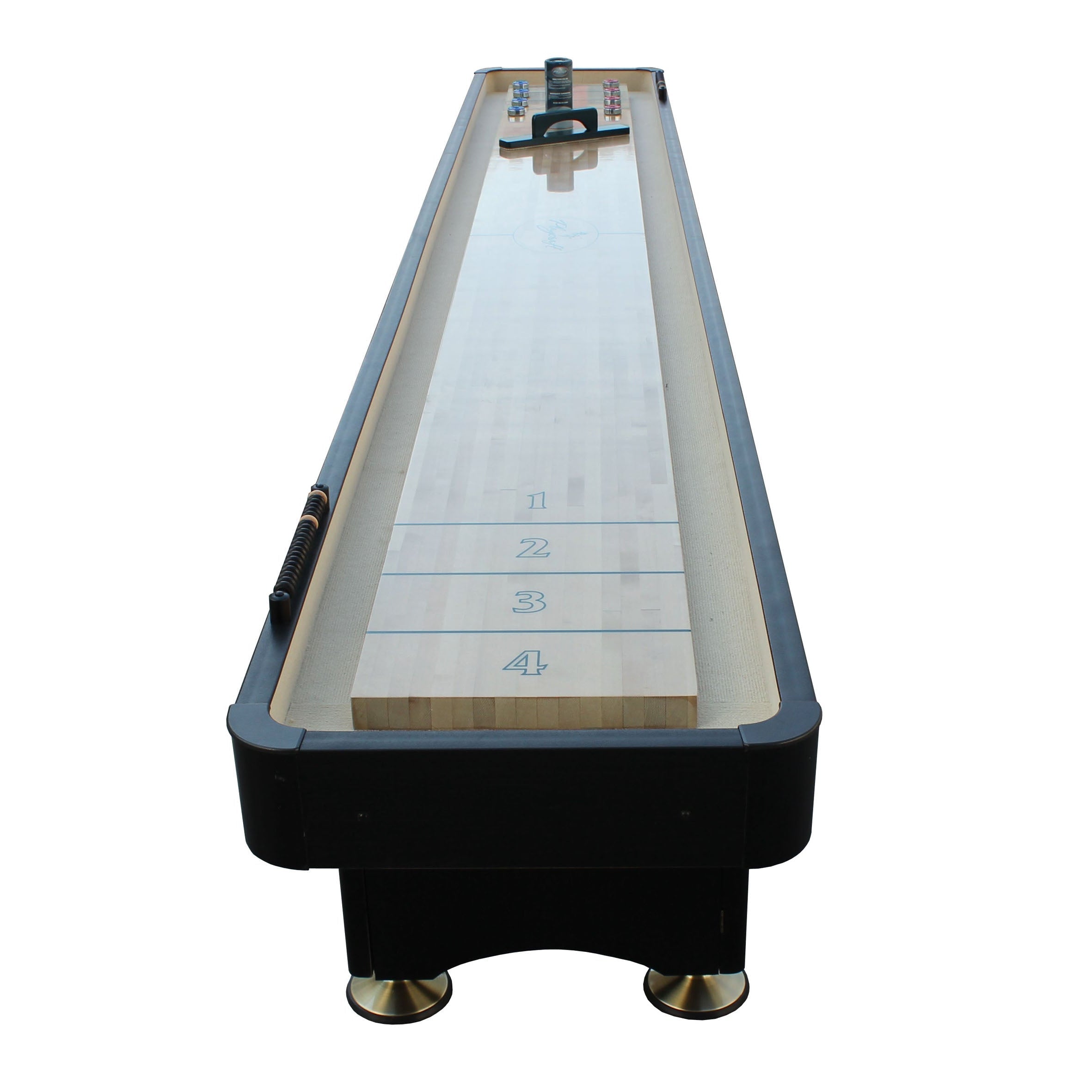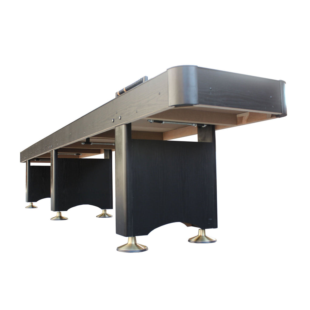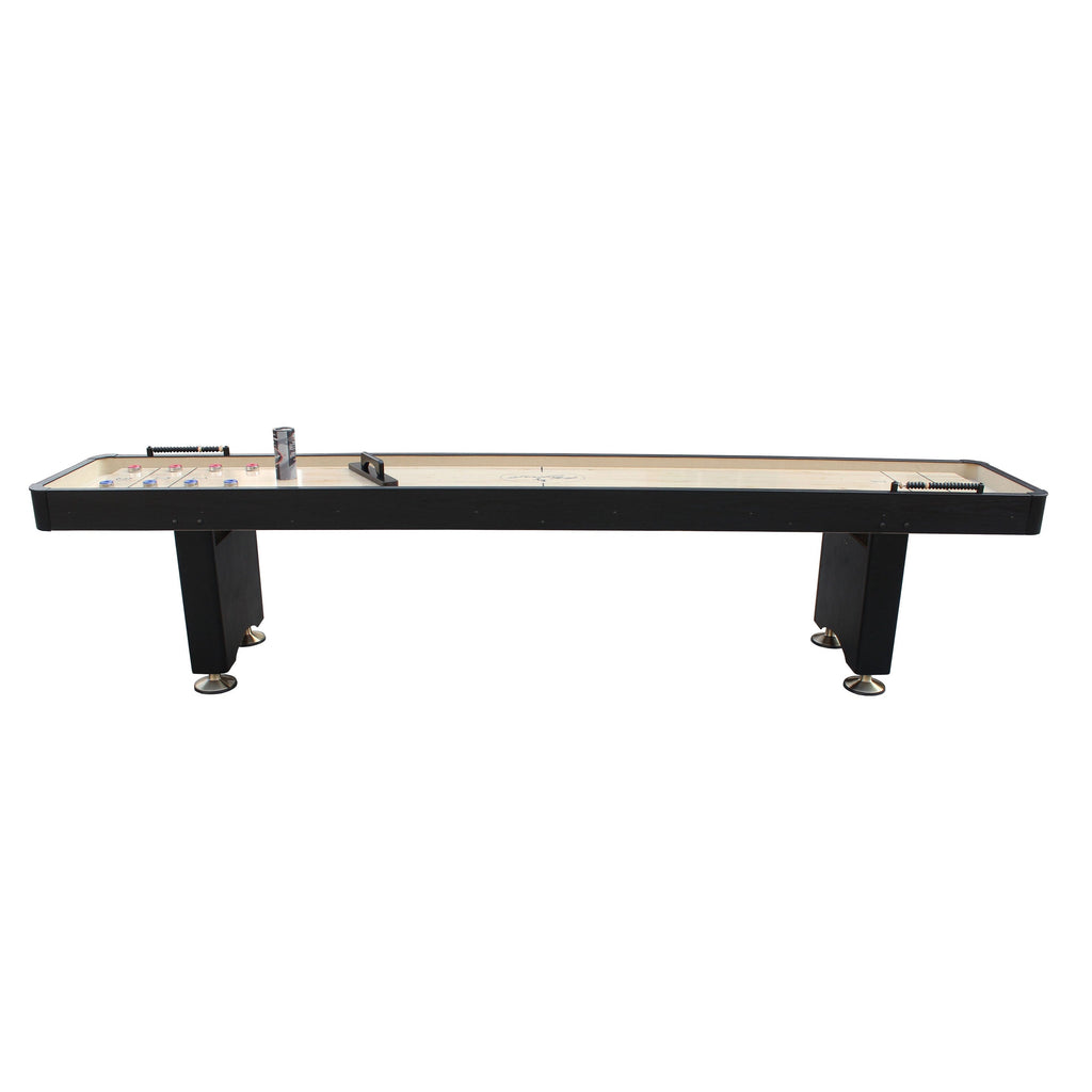 All Woodbridge models feature a solid plywood framing structure. There is in leg storage, abacus scoring, speed wax and 8 deluxe pucks. The Woodbridge is available in 9', 12', 14' and 16' lengths. Colors are espresso, cherry, black, and honey oak. Black finish, 9', 12', and 14' ONLY.