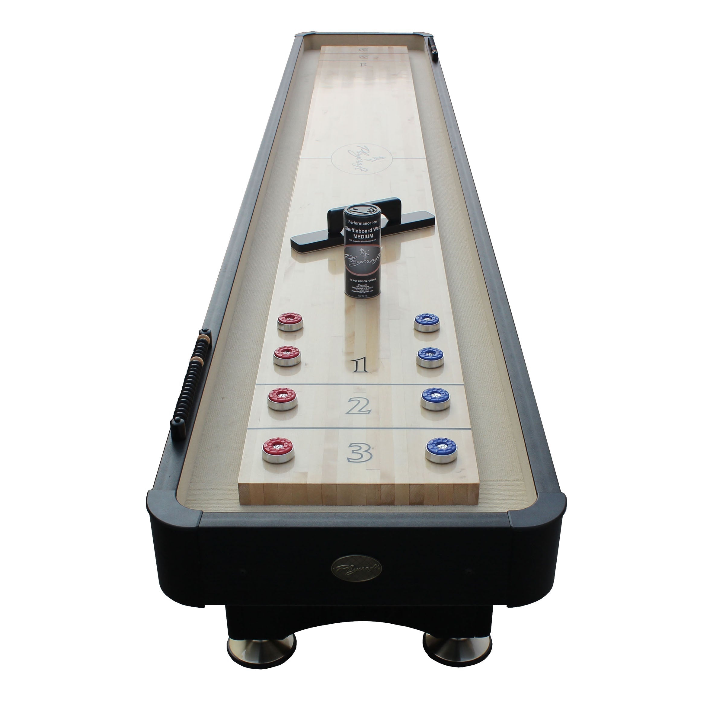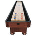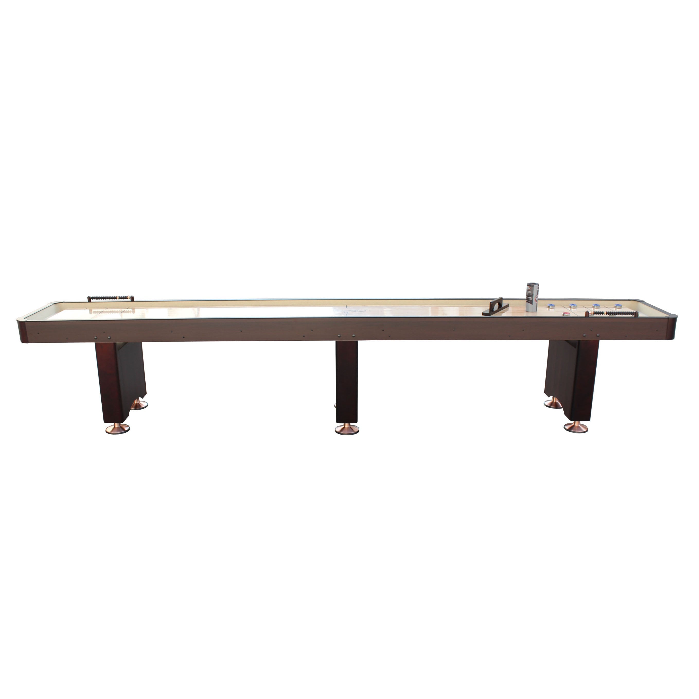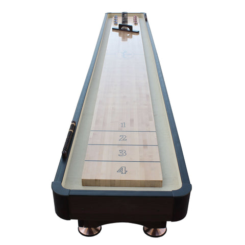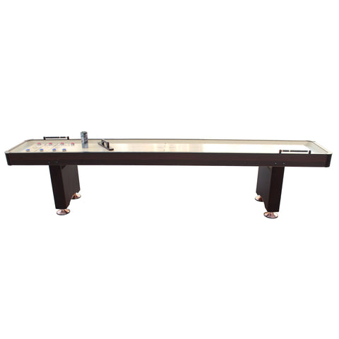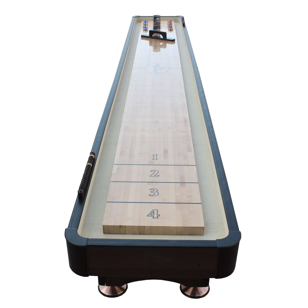 All Woodbridge models feature a solid plywood framing structure. There is in leg storage, abacus scoring, speed wax and 8 deluxe pucks. The Woodbridge is available in 9', 12', 14' and 16' lengths. Colors are espresso, cherry, black, and honey oak. Black finish, 9', 12', and 14' ONLY.
