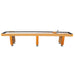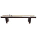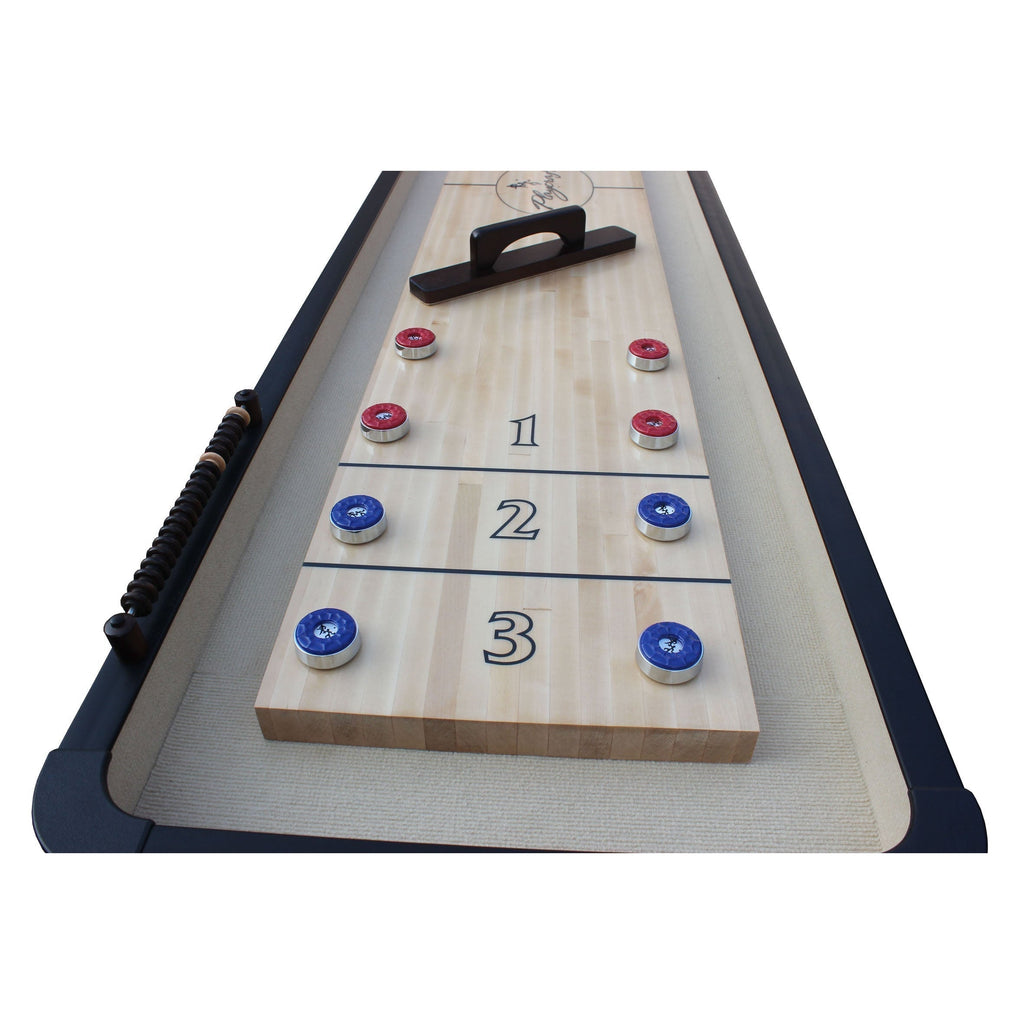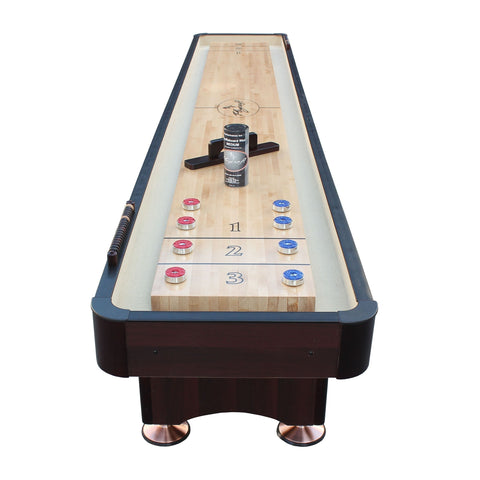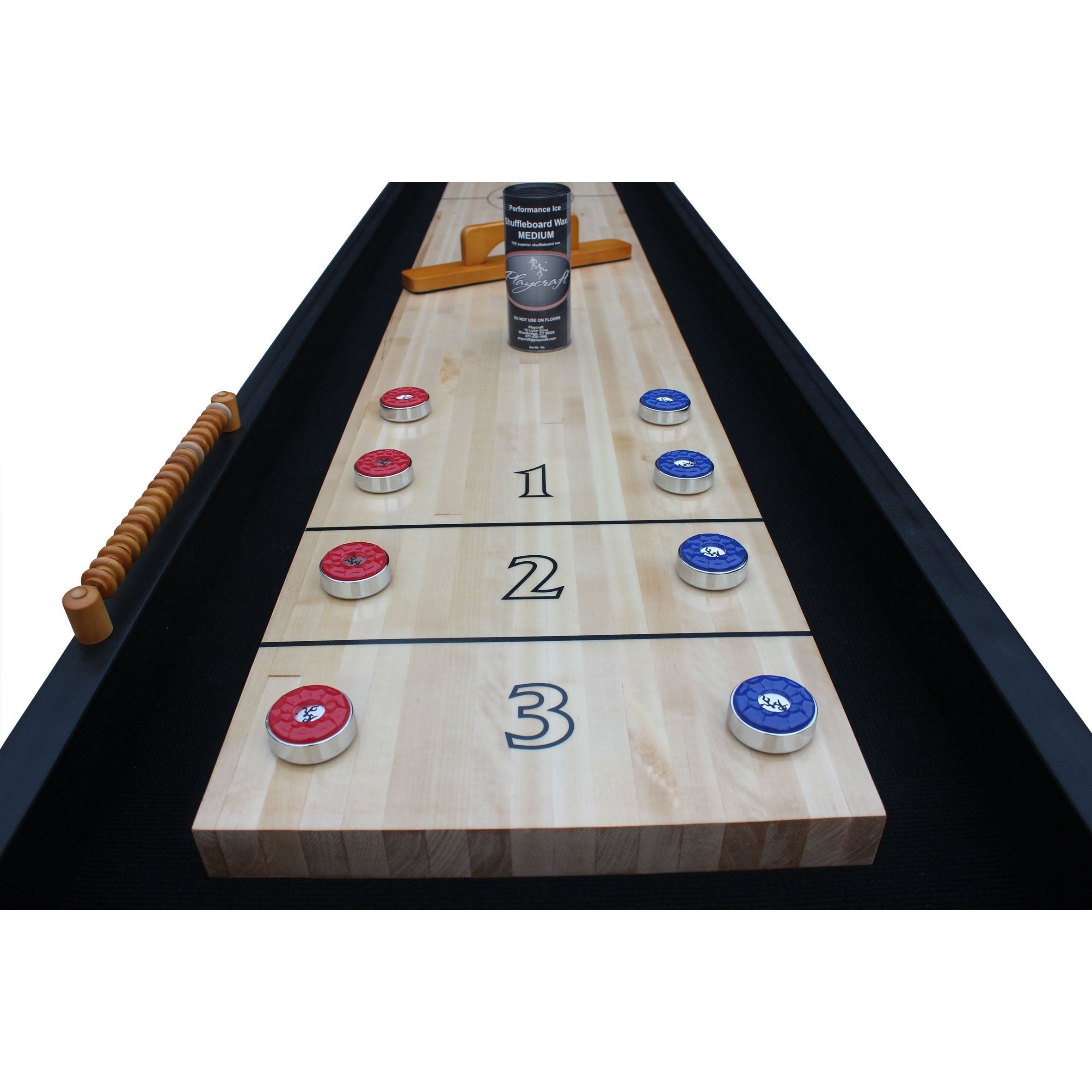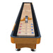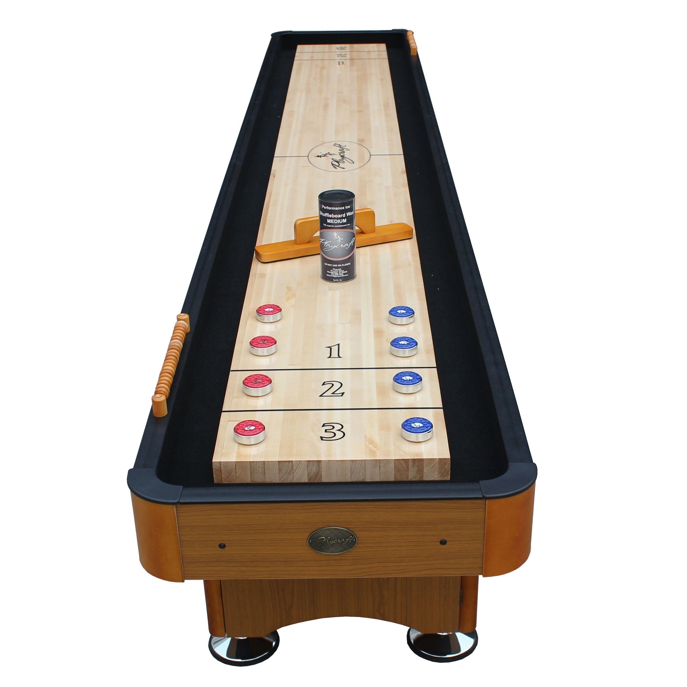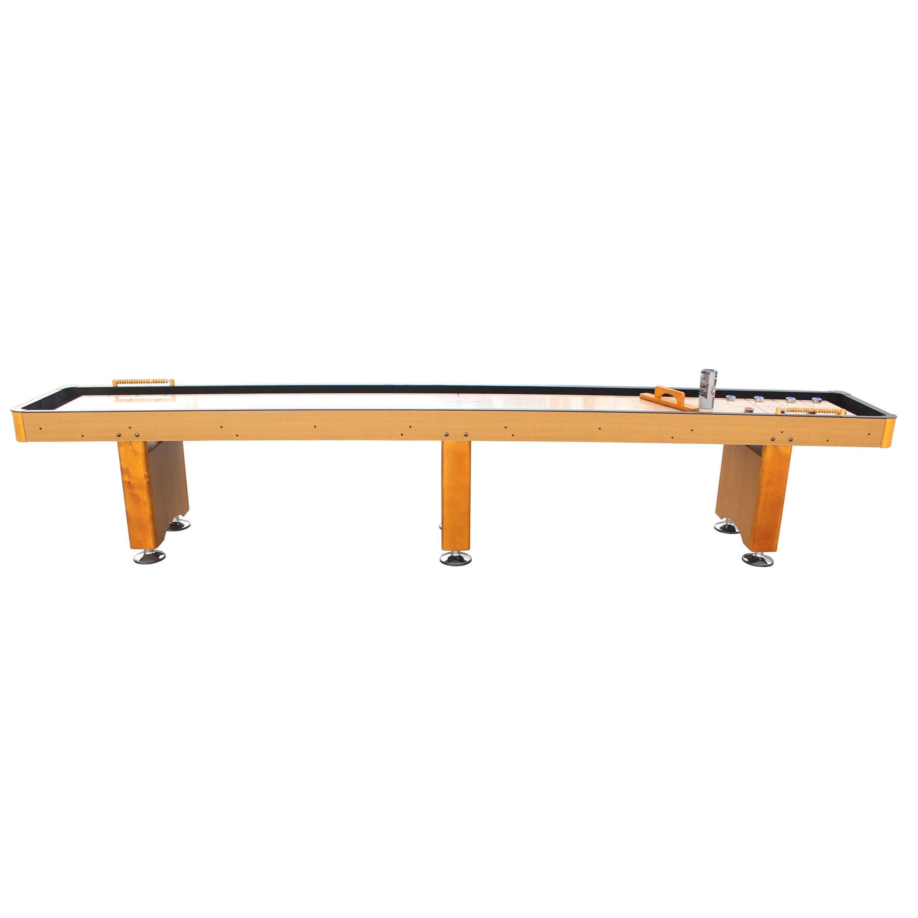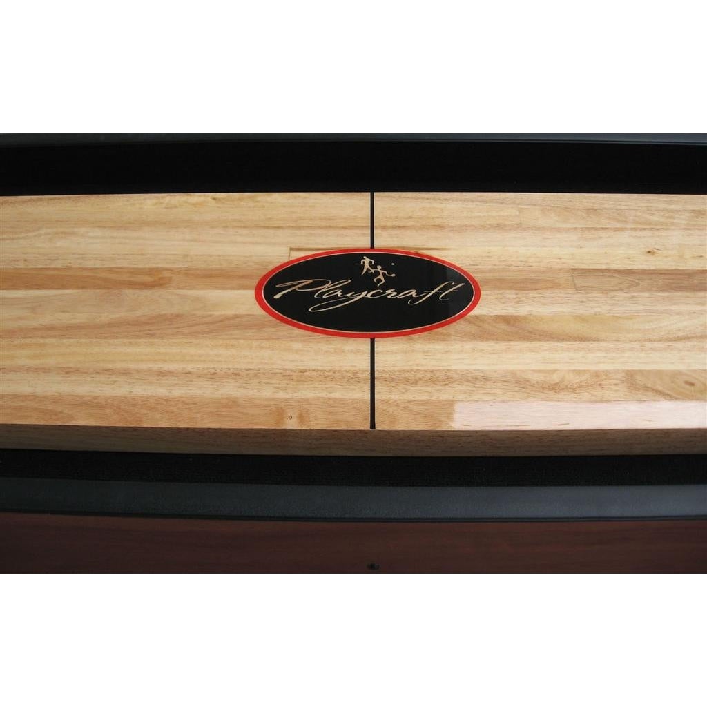 The playfield is a hardwood solid butcher block that is 15" wide, 1.75" thick and one foot less than the overall length of the shuffleboard in question. When comparing manufacturers, make sure to look for a 1.75" thick playfield, as the extra depth looks better in the cradle and feels better on the hand when setting a puck. The shuffleboard playfield logo style and/or position may vary.
