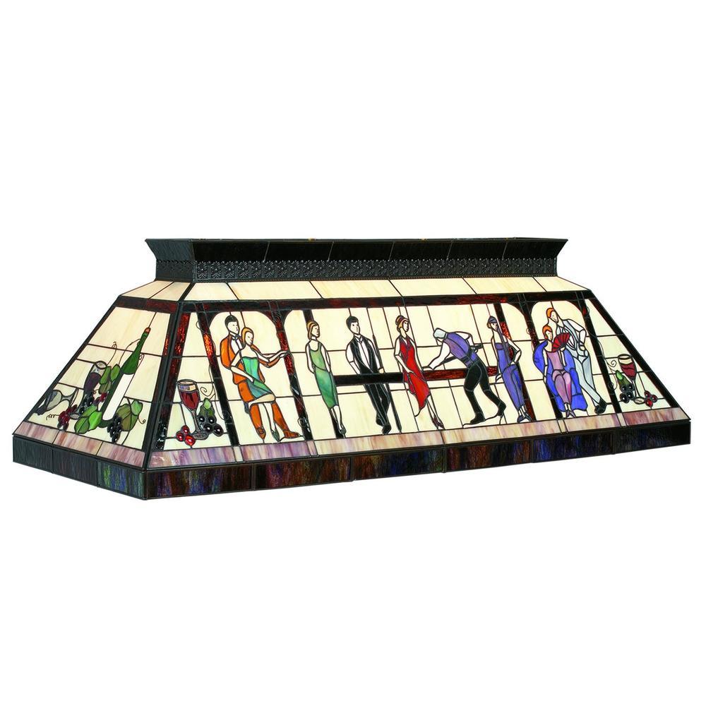 Drinks, dancing, and gaming are beautifully portrayed in stained glass of this 44-inch Tiffany-style billiard light with copper foil construction.