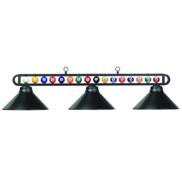 A cheeky tribute to a favorite pastime, this metal billiards light looks fabulous over a pool table or augmenting a home lounge. Delivering excellent lighting, this 3-light fixture boasts an open metal bar frame complete with a line of resin billiard balls. Three metal shades are matte black, delivering classic character and warmth.
