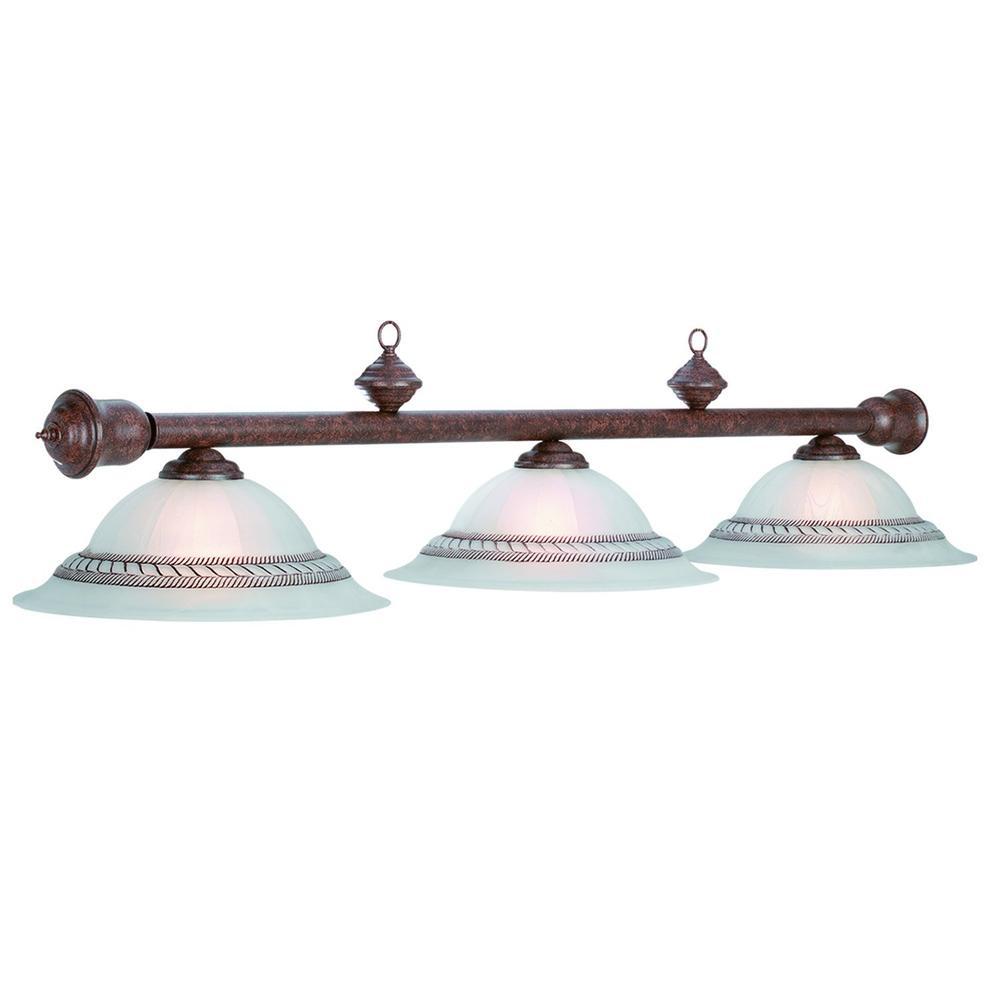 A linear silhouette hosts three detailed glass shades to complement this three-light billiard pendant in a rustic old brown finish.