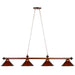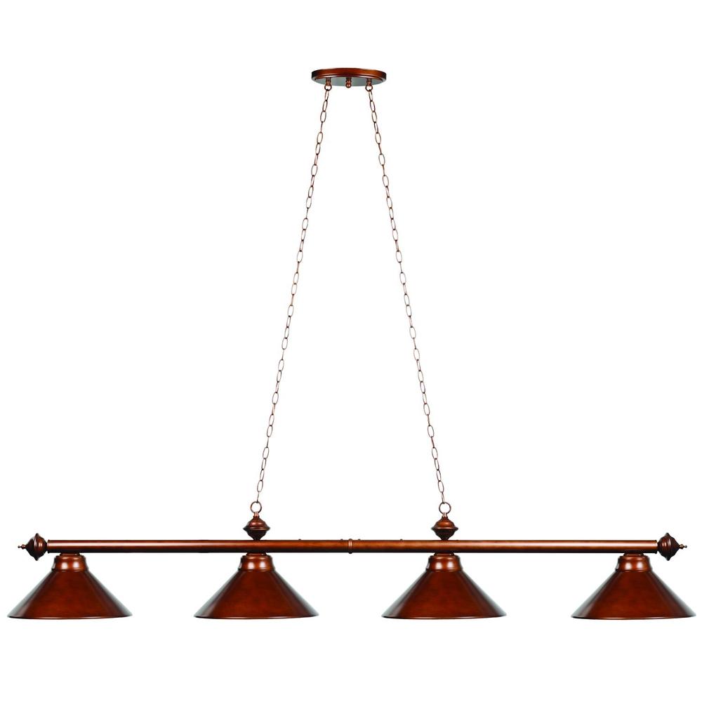 A linear design specifically designed to illuminate a pool table, this metal four-light billiards island pendant is set in a metal framework, finished in a chesnut that matches its shades and makes a dramatic impact.