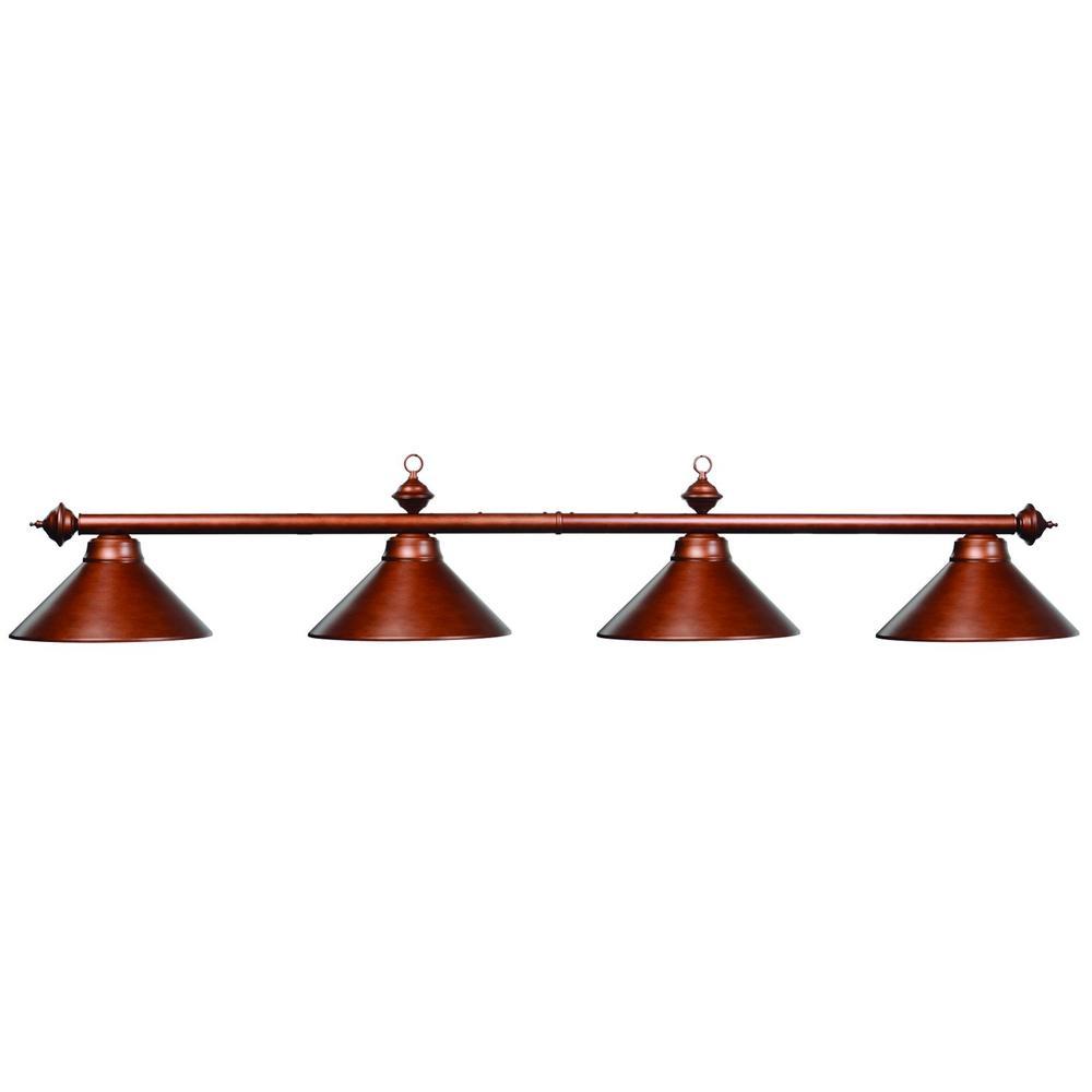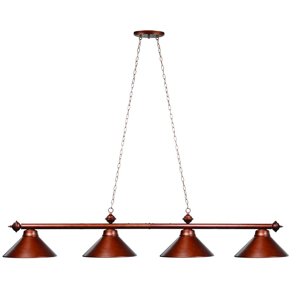 A linear design specifically designed to illuminate a pool table, this metal four-light billiards island pendant is set in a metal framework, finished in a english tudor that matches its shades and makes a dramatic impact.