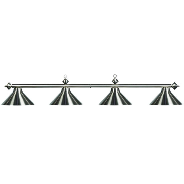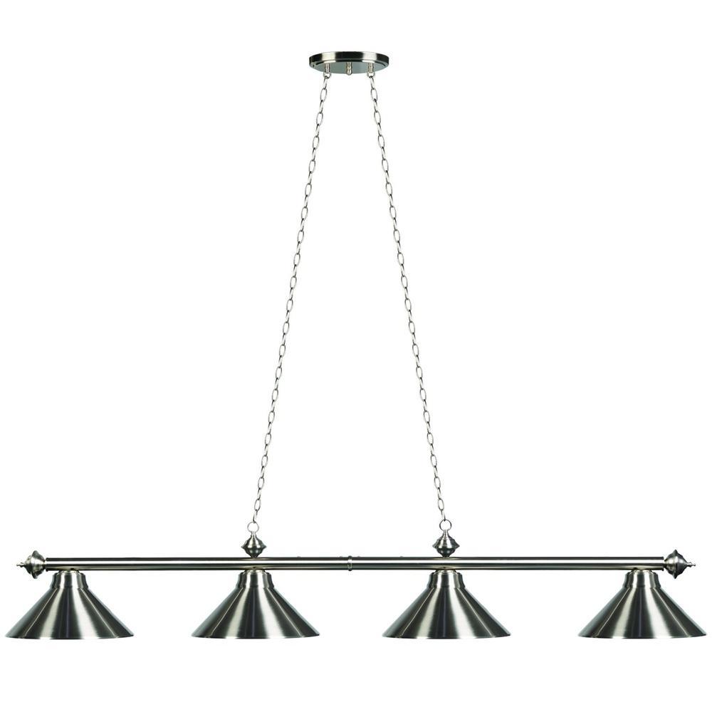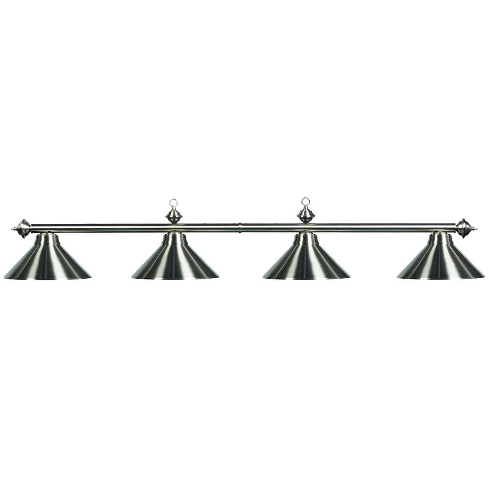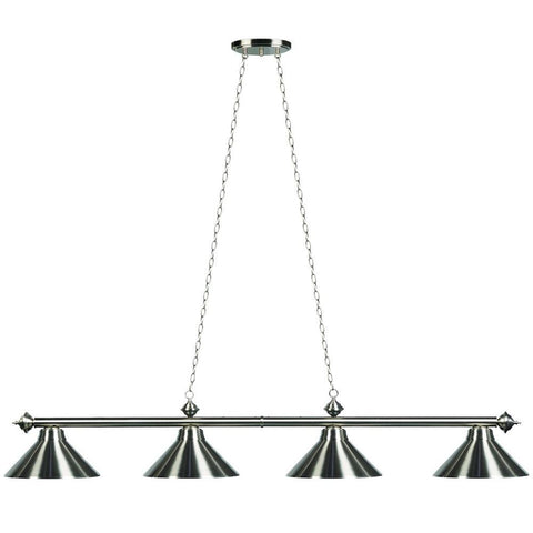 A linear design specifically designed to illuminate a pool table, this metal four-light billiards island pendant is set in a metal framework, finished in a stainless that matches its shades and makes a dramatic impact.