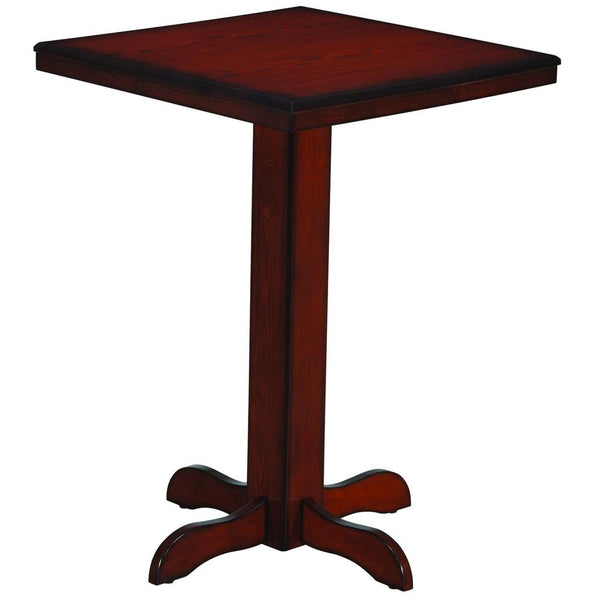 Host a card game or dish up delicious eats at this striking square pub table with a pedestal base and beautiful warm chestnut finish.