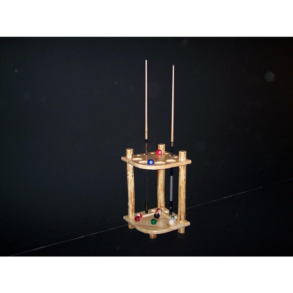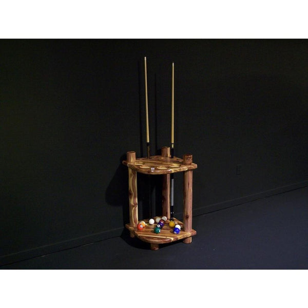 The pine log, klondike log or barnwood cue racks will go with any lodge, rustic or western pool table. In the pine log, klondike and barnwood there are corner cue racks, standard floor cue racks, framed wall, and 2 piece wall cue racks available. We also carry matching floor and corner cue racks in the Red Cedar and Ironwood style. All of our corner and standard floor cue racks have four drink holders with cork insert, ball storage, chalk storage and storage for up to six cue sticks. If any of these cue racks don't fit your needs, a custom cue rack can be made just for you.