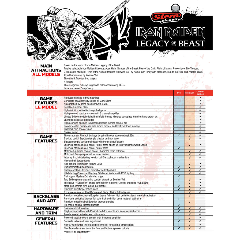 All models include twelve Iron Maiden songs with players going to battle as Eddie with the help of four flippers, two spinners, a set of 3-bank drop targets, metal and wireform ramps, a captive ball mechanism, a dual up-post lock mechanism, and a center bullseye target.
