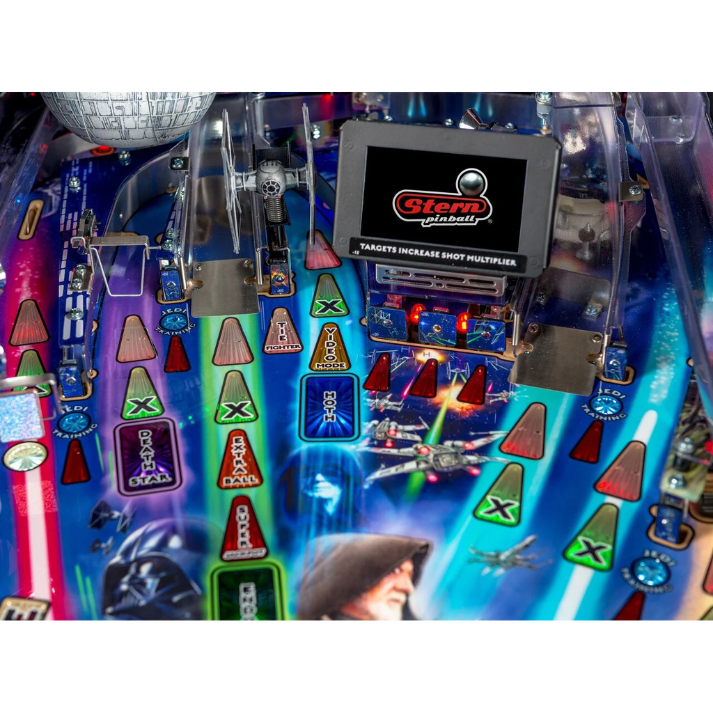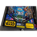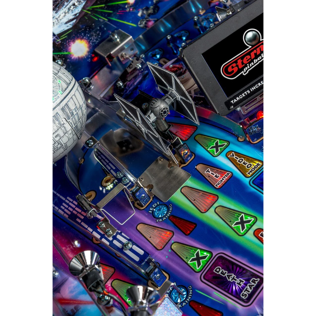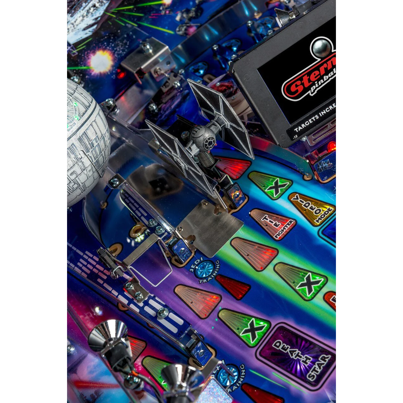 The Star Wars LE and Premium models have even more features and devices, including a Hyperdrive magnetic ball accelerator, all-metal ramps, and a Death Star that explodes to release balls locked for multiball. The LED-lit Millennium Falcon is available as an accessory for the Pro. Each version has a distinct hand-drawn Star Wars art package, with the LE featuring themed Millennium Falcon art and laser-cut side armor, and the Premium showcasing The Dark Side.