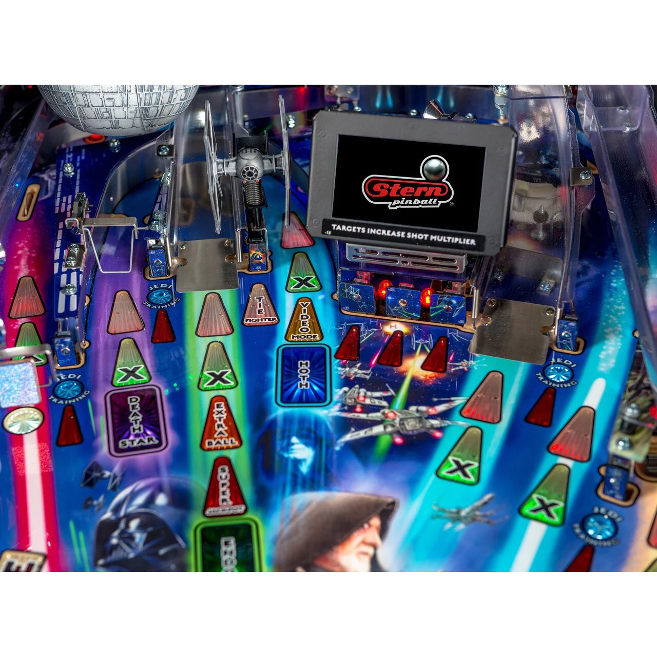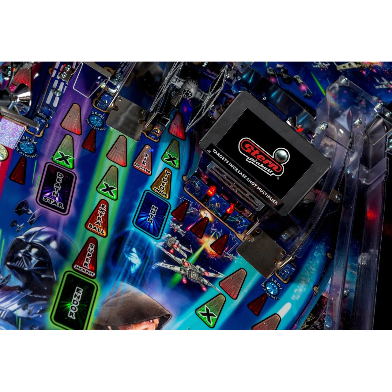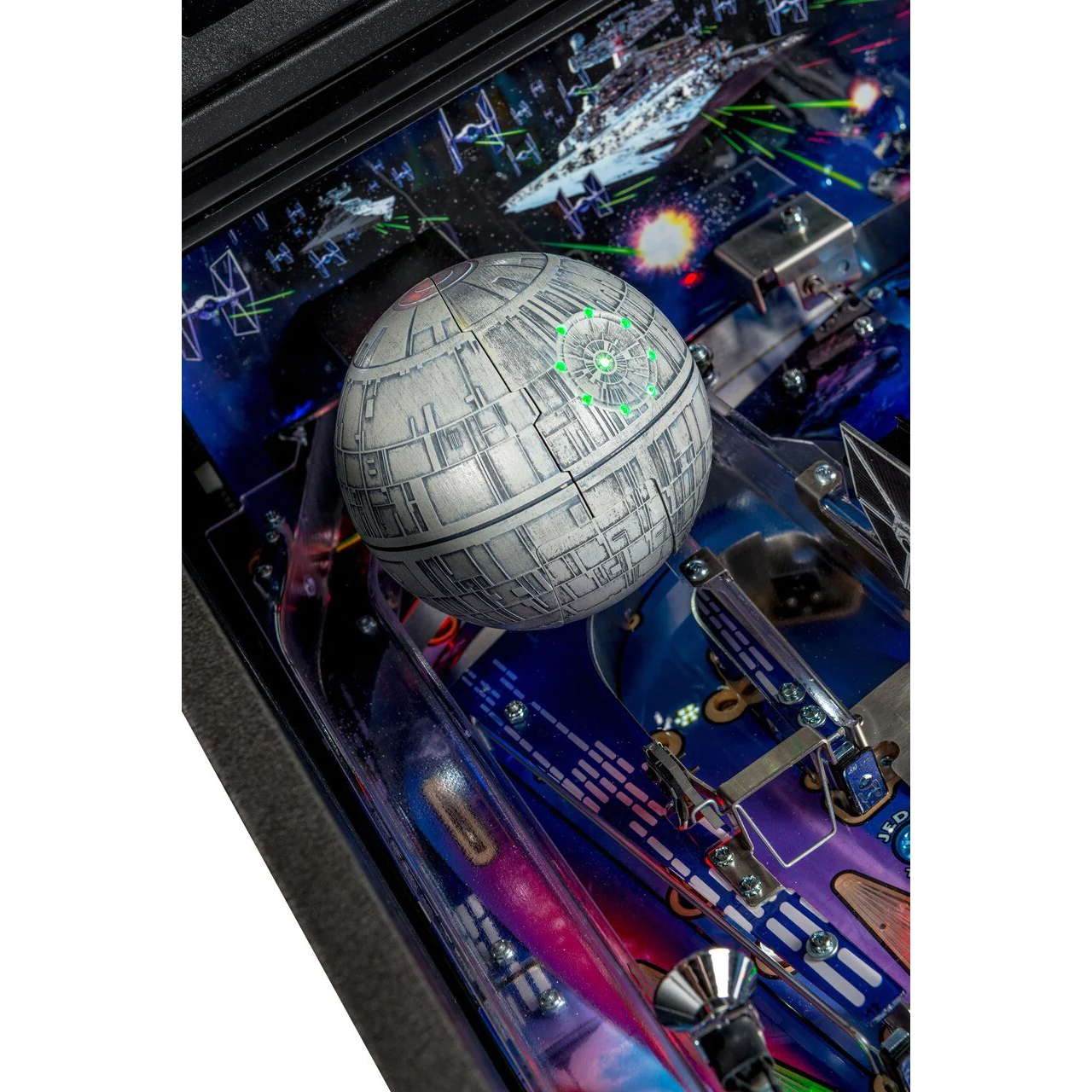 The Star Wars LE and Premium models have even more features and devices, including a Hyperdrive magnetic ball accelerator, all-metal ramps, and a Death Star that explodes to release balls locked for multiball. The LED-lit Millennium Falcon is available as an accessory for the Pro. Each version has a distinct hand-drawn Star Wars art package, with the LE featuring themed Millennium Falcon art and laser-cut side armor, and the Premium showcasing The Dark Side.