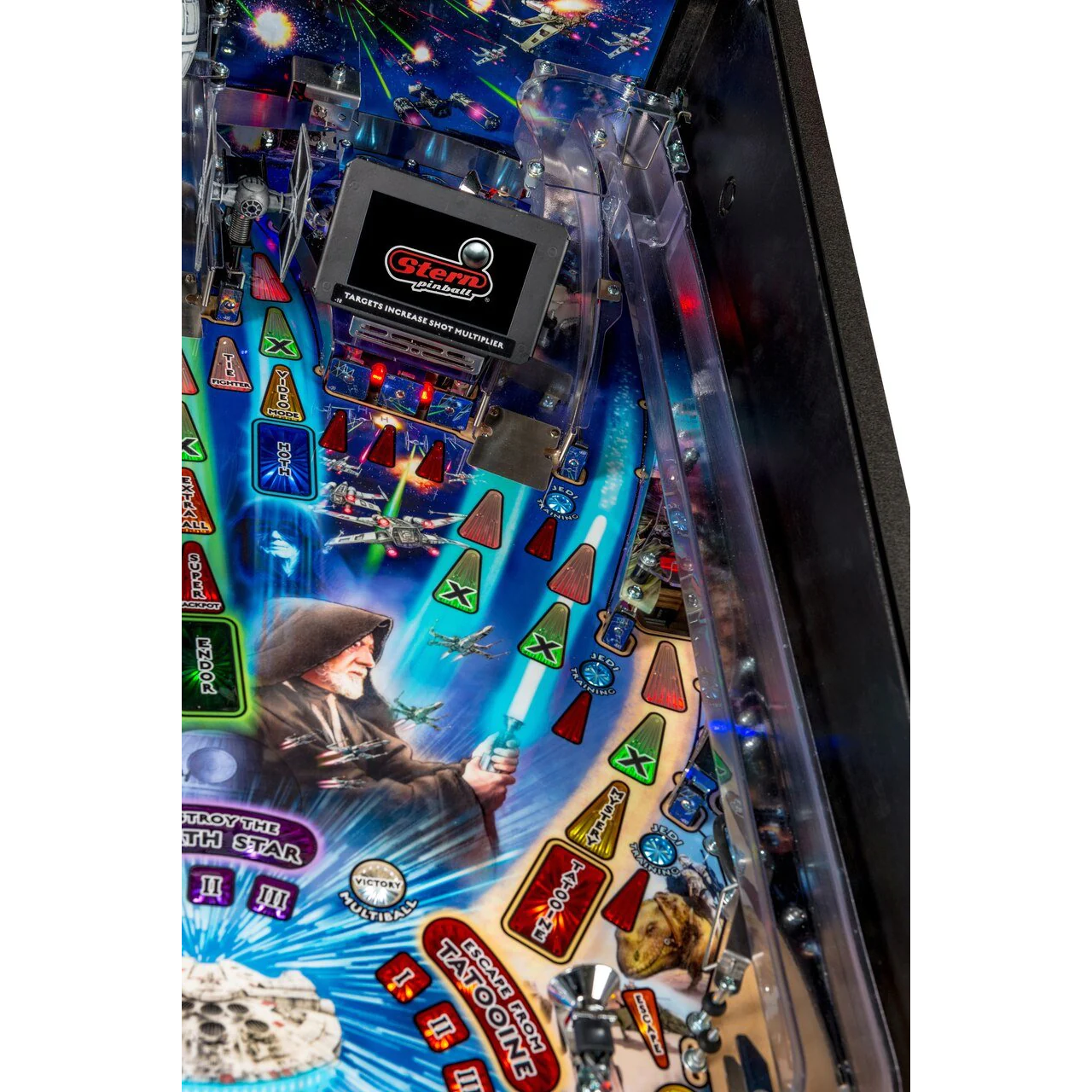 The Pro model is loaded with features, including speech and footage from the original Star Wars trilogy, color-changing LED-lighted inserts, and a sculpted TIE Fighter. The playfield features a 4.25 inch LCD for player instruction and feedback, and a larger backbox-mounted LCD displaying up to 400 Star Wars video scenes. Players can choose to play as Hans, Leah, R2D2, or Luke, and must pick their award at the start of each ball, affecting gameplay strategy. Unique player-controlled LCD fight modes are played while the ball remains active on the playfield.
