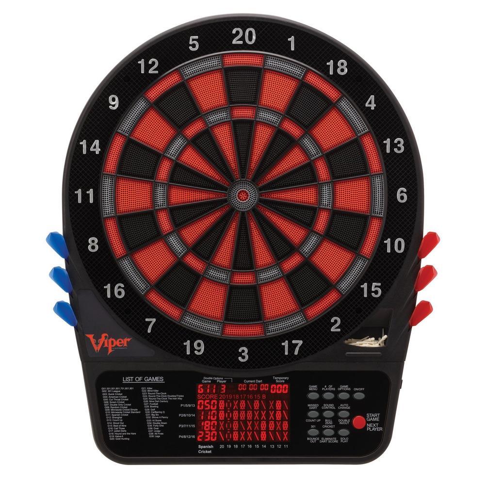 Become a virtuoso of darts with the Viper 800 electronic dartboard! Featuring the regulation size, 15.5” dartboard target face, you’ll play on the same size the masters use. Surrounding the target face is a large missed dart catch ring to protect your wall from errant throws. The 800 features 57 dart games, including the exclusive Spanish and Minnesota Cricket, and 307 scoring options to assure that you’ll never run out of ways to destroy your adversaries. Popular options include Single In/Out, Double In/Out and Double Bull. The stylish color scheme utilizes vibrant red and sharp silver on a deep black to ensure you can always see where your darts land.