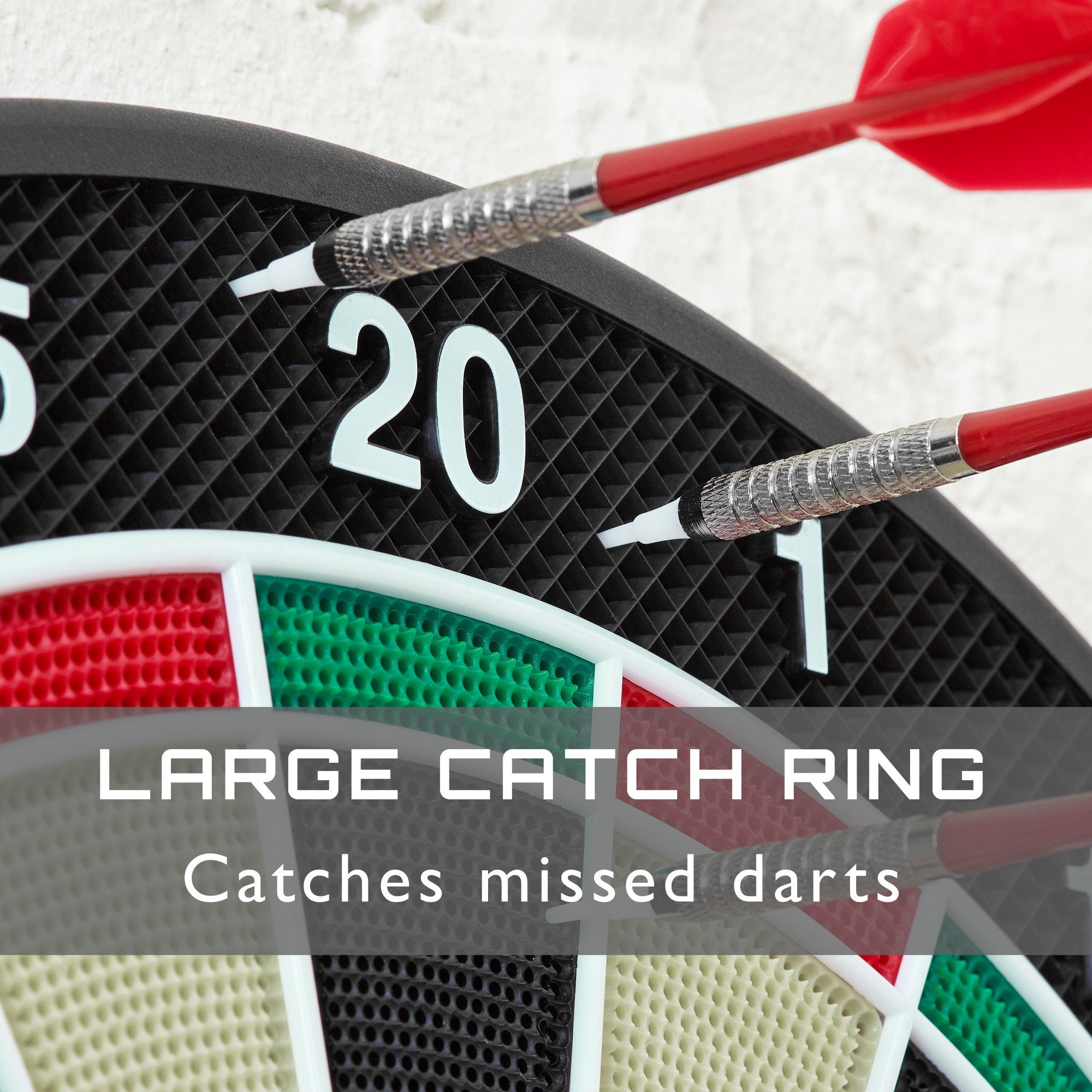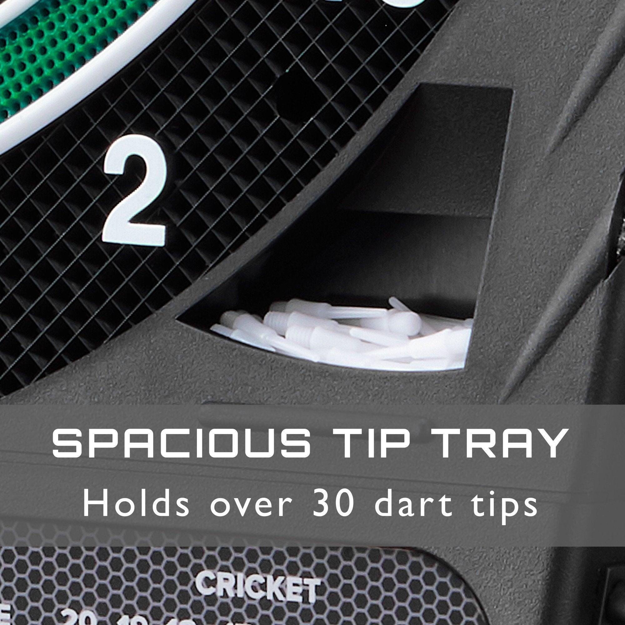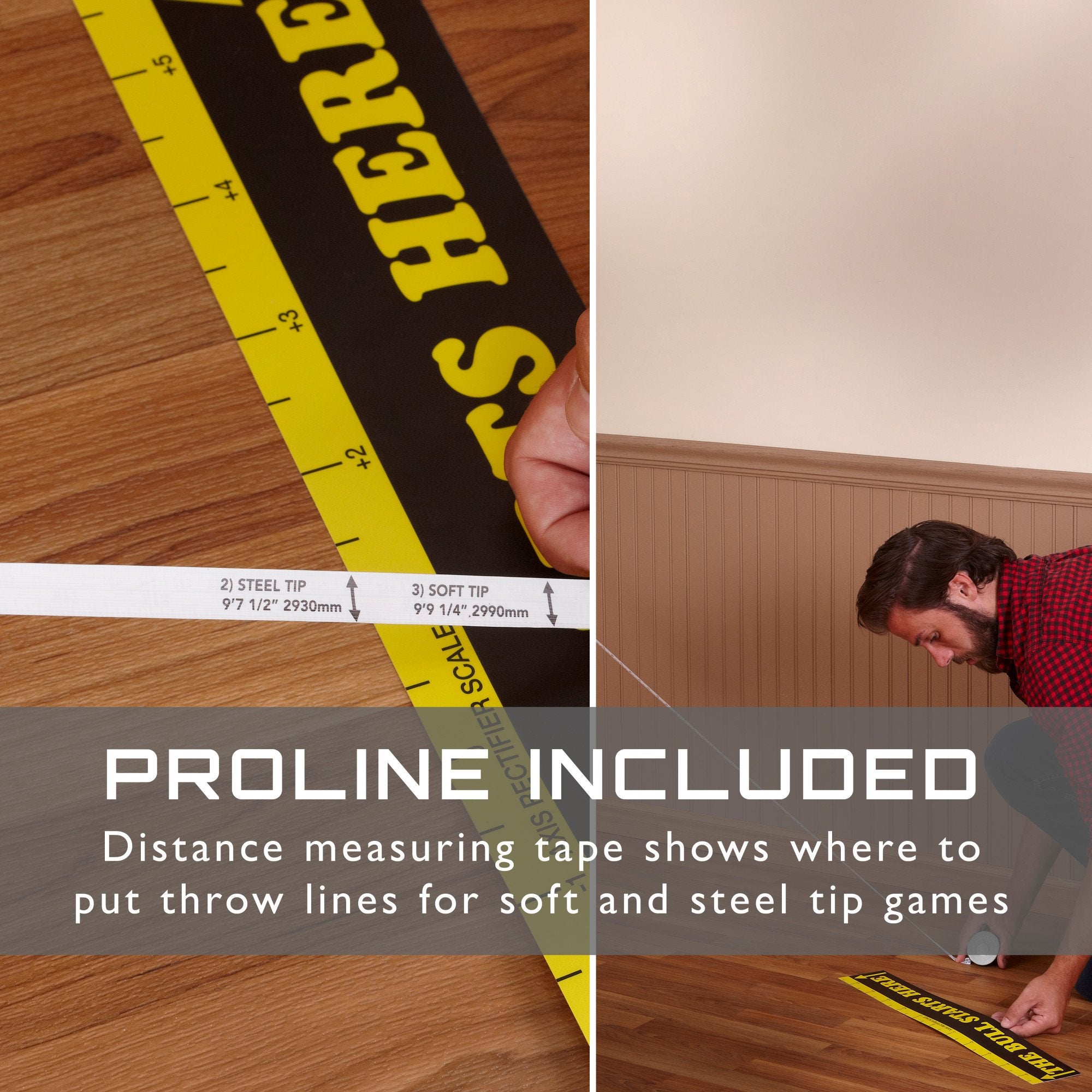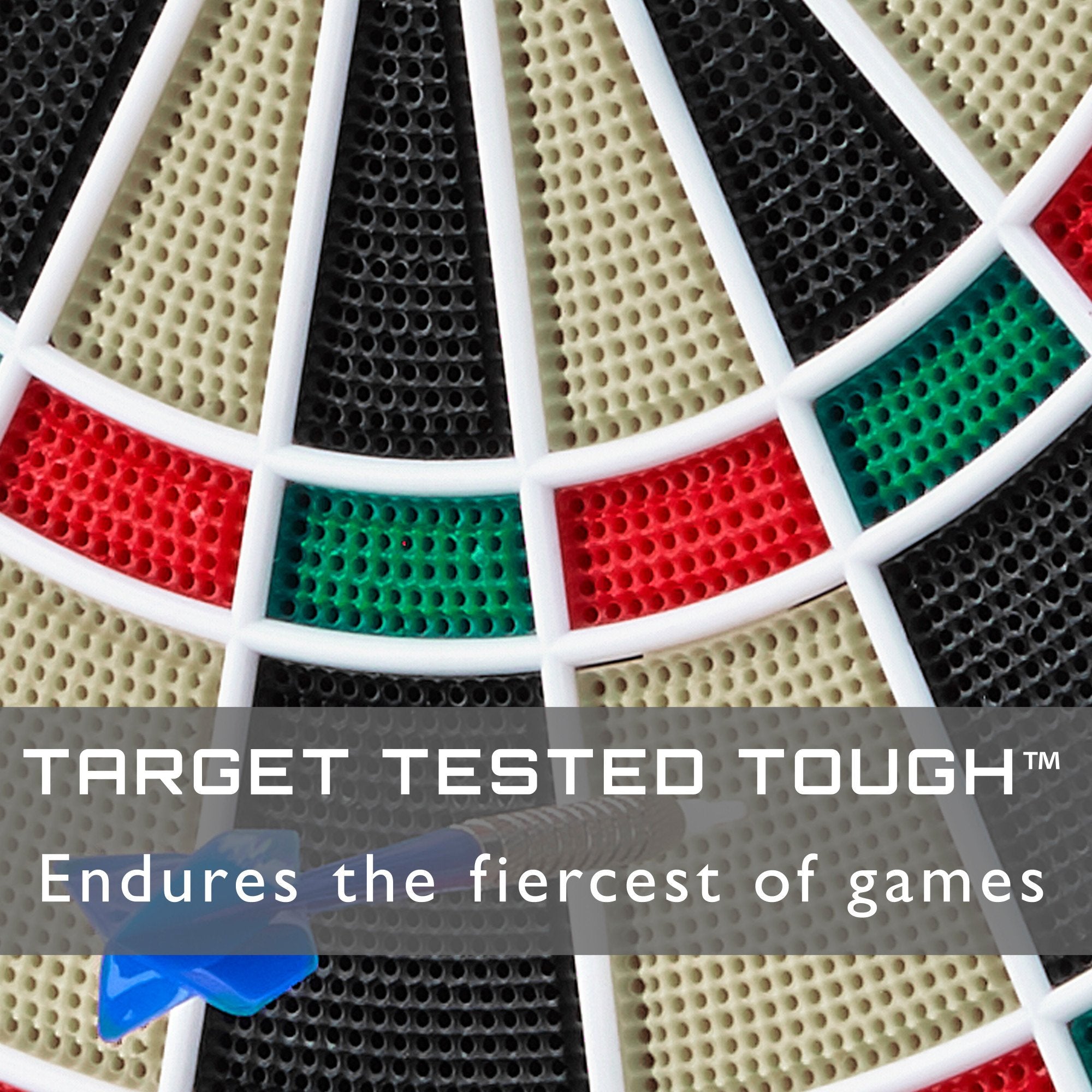 The 850 features an expertly constructed 15.5” target face for heavy use and high scores. Featuring Target-Tested-Tough segments made from High Grade Nylon, the 850 endures the toughest throws! Each segment features locking holes and is connected by ultra-thin spider to minimize bounce outs and maximize scores. The 850 includes six soft tip darts to get you throwing right away and a throw line measuring tape to ensure your games are from the right distance.
