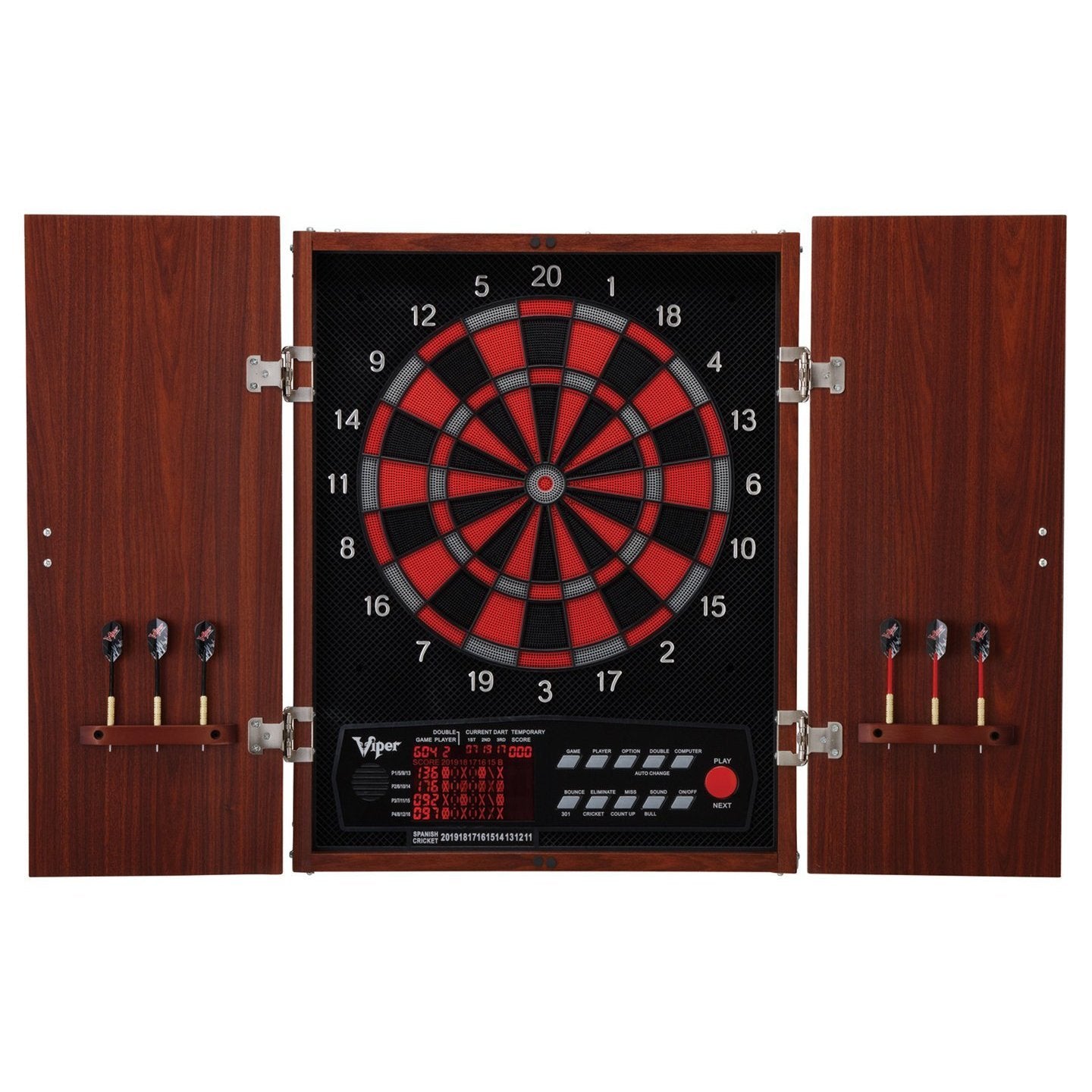 Surrounding the target face is a large missed dart catch ring to protect your wall from errant throws while the built in cabinet doors feature convenient dart storage. The Neptune features 57 dart games, including the exclusive Spanish and Minnesota Cricket, and 307 scoring options to assure that you’ll never run out of ways to put your darting skills on display. Popular options include Single In/Out, Double In/Out and Double Bull. The stylish color scheme utilizes sharp red and silver on a deep black to ensure you can always see where your darts land.